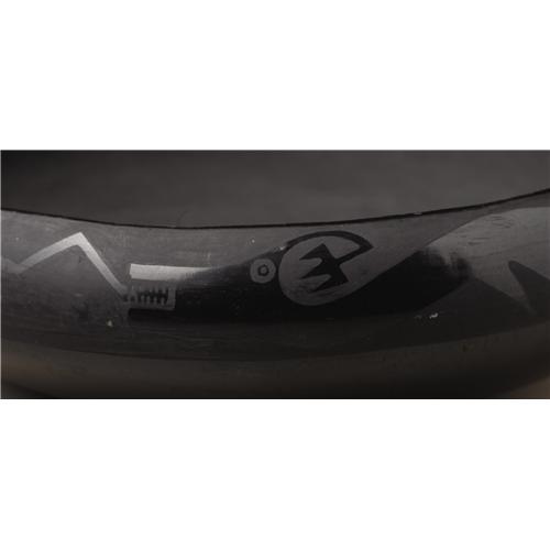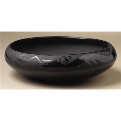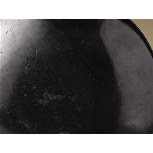 <B>San Ildefonso Blackware Pottery Bowl</B></I><BR>Circa 1923-1926<BR>Height 2 3/8 in. Diameter 7 1/2 in.<BR><BR>This compressed globular bowl is decorated with an undulating avanyu (water serpent) and rain cloud accents on the polished ground against the matte painted surface. The base is signed "Marie." Maria Martinez was the first Pueblo potter to sign her pottery on a regular basis. 1923 is the generally accepted date for this practice to begin. "Marie" was selected instead of "Maria" because it was suggested that Marie was a name more familiar to the non-Indian public.<BR><BR>Provenance<BR>Bonhams and Butterfields, Sale 7437E, Lot 5393, June 9, 2003.<BR><BR>Reference<BR>Spivey, Richard, <I>Maria,</B></I> Northland Publishing, Flagstaff, Arizona, 1994, pp. 63-68.<BR><BR>