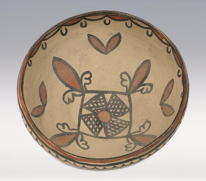 San Ildefonso Bowl. 6" x 12". Black and red designs on tan slip. 1930s. Condition Report: Minor scrapes and scratches. Generally in sound condition.
