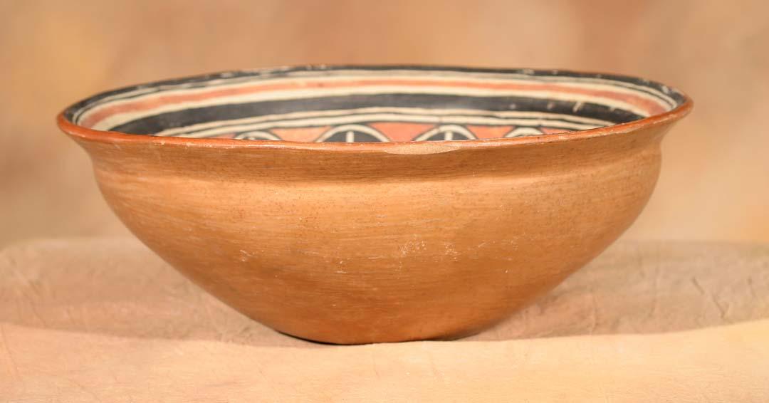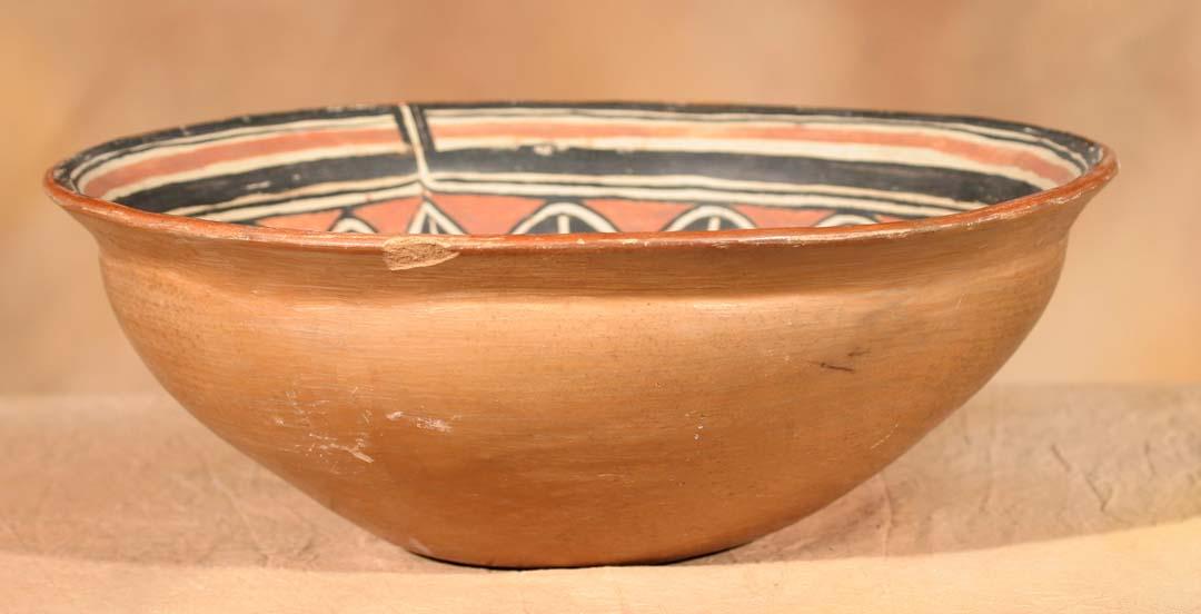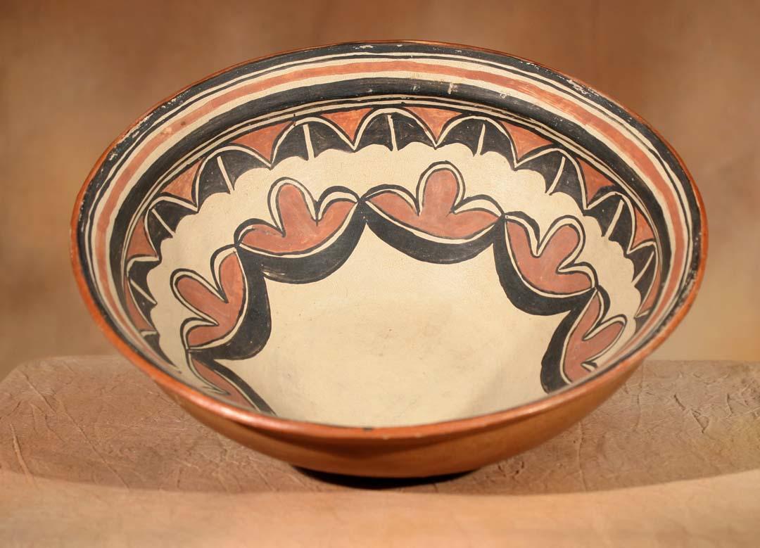 San Ildefonso Dough Bowl. 5 ½" x 14 ¼". Polychrome with floral designs in red and black. Possibly the work of Martina Vigil/Florentino Montoya. Red rim, unslipped exterior. Circa 1900. (est $2,000-3,000). Provenance: Bethany College, Lindsborg, KS. For condition reports please visit: www.auctioninsantafe.com/cr2011.pdf