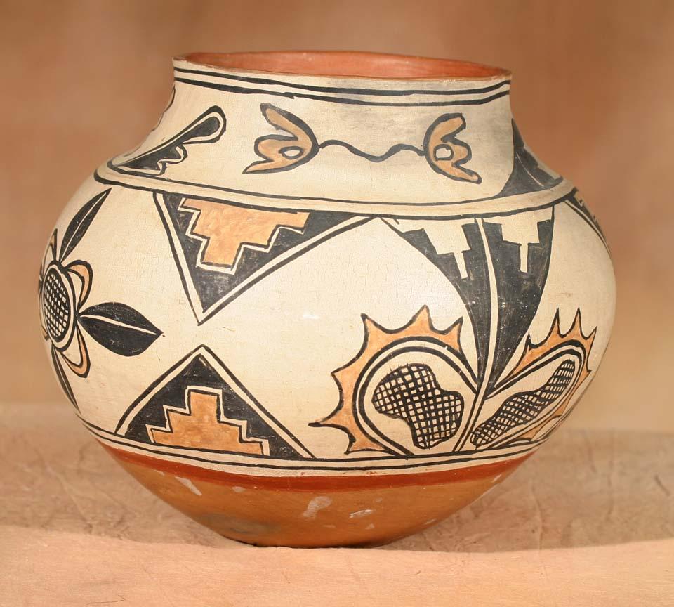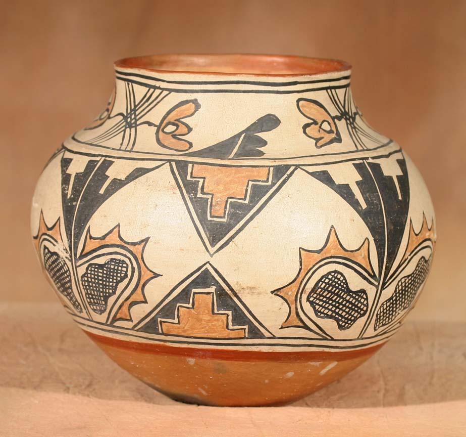 San Ildefonso Polychrome Jar. 9 ½" x 10". Featuring stepped kiva designs, cross-hatching and abstract floral designs. Secondary red band above the base and a red rim. Circa 1900. (est $2,000-3,000). Provenance: Bethany College, Lindsborg, KS. For condition reports please visit: www.auctioninsantafe.com/cr2011.pdf