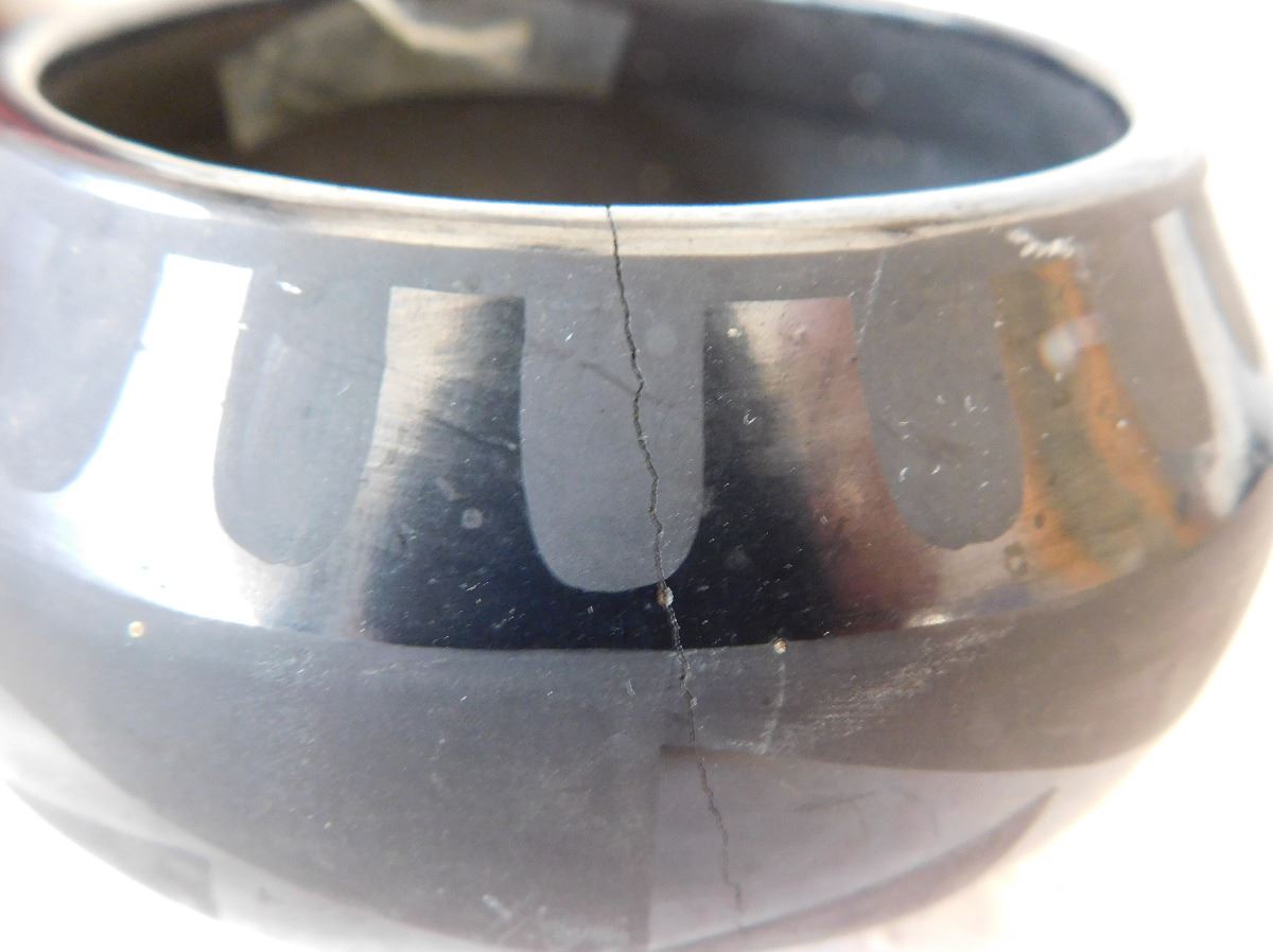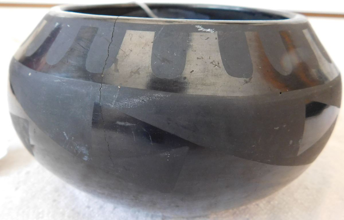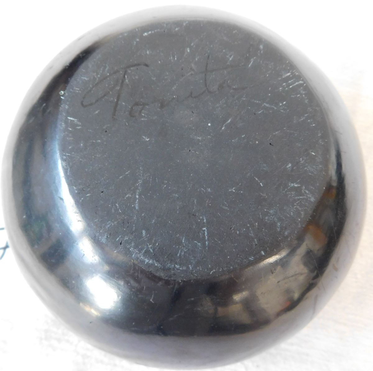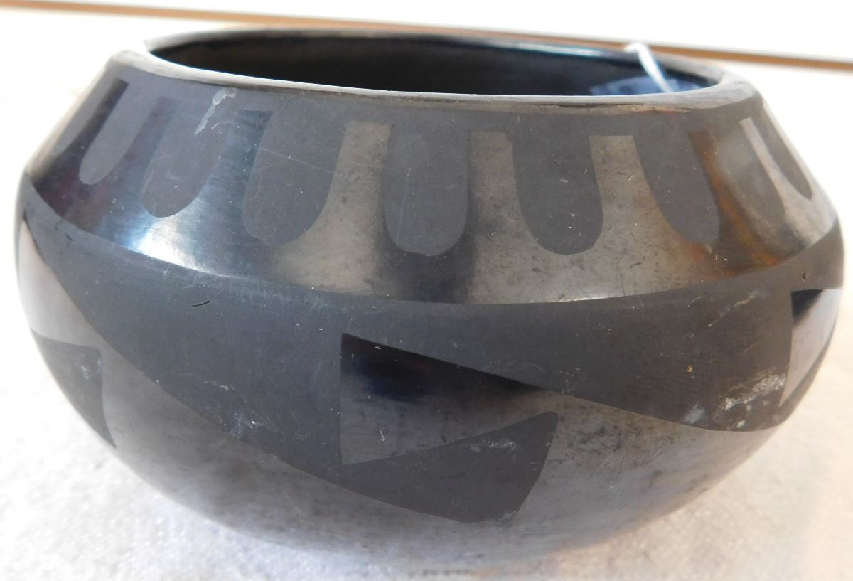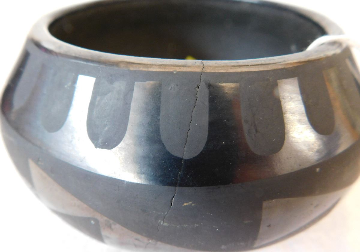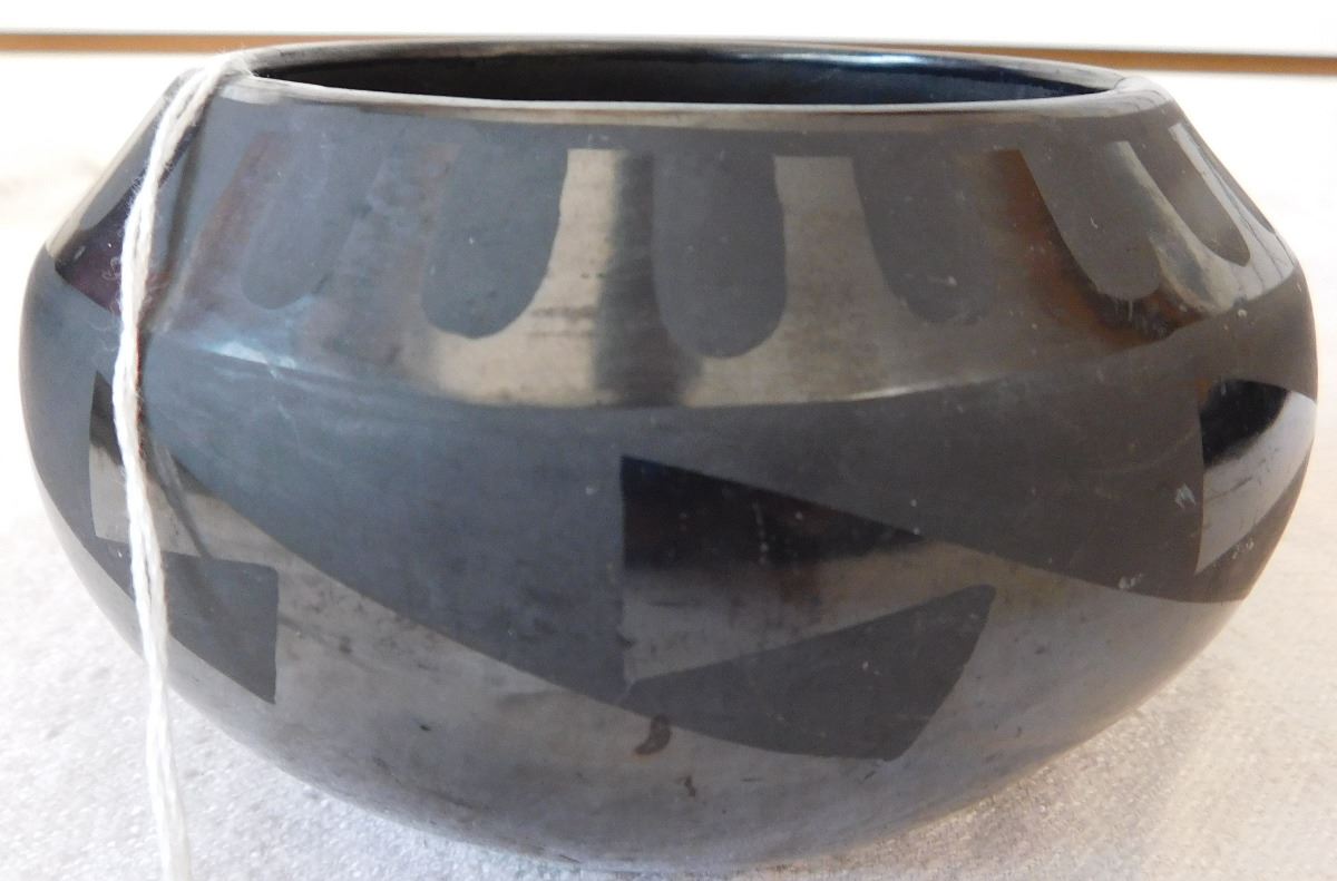 San Ildefonso Olla, circa 1950s. Made of clay and paint, item measures 5 1/2 x 3 1/2 and is signed by Tonita. From Central New Mexico. This olla has a very classic design. Condition: Has one or two, small hairline-cracks, see images. Shipping: $24.00, requires double-box.