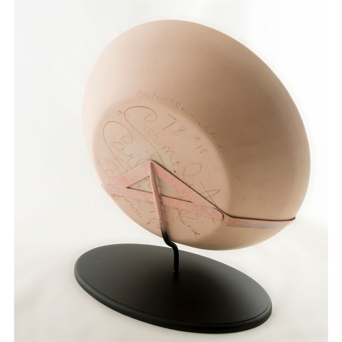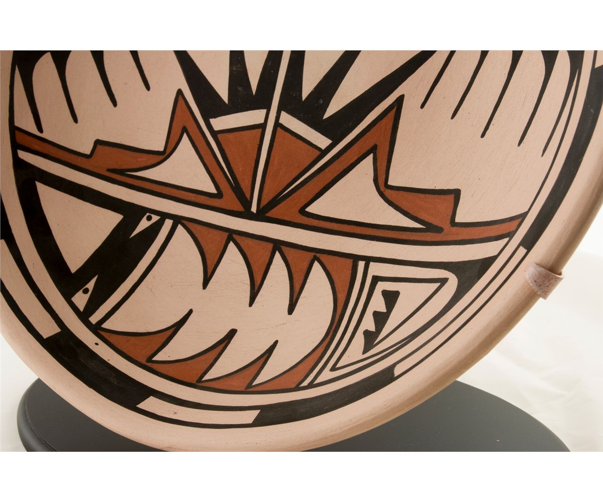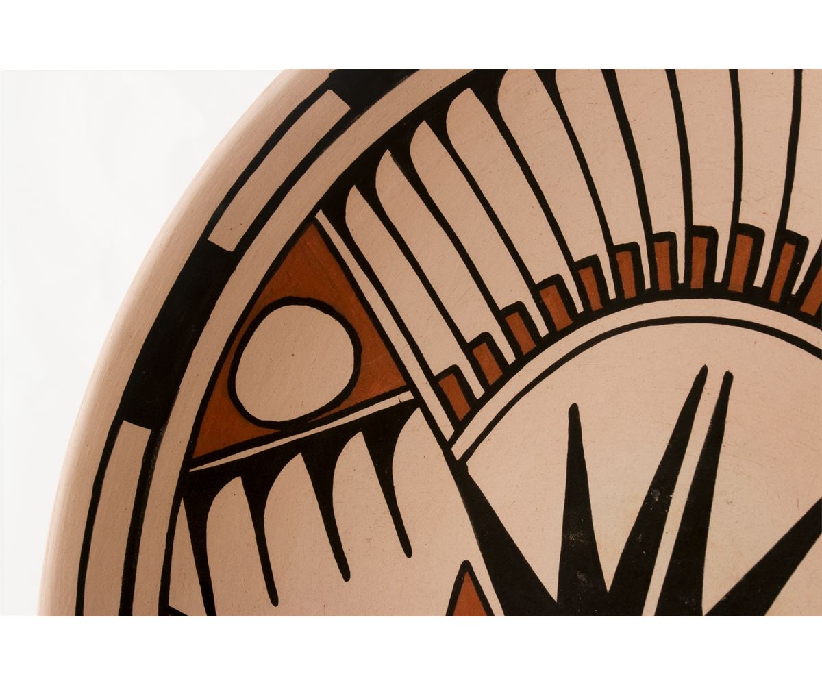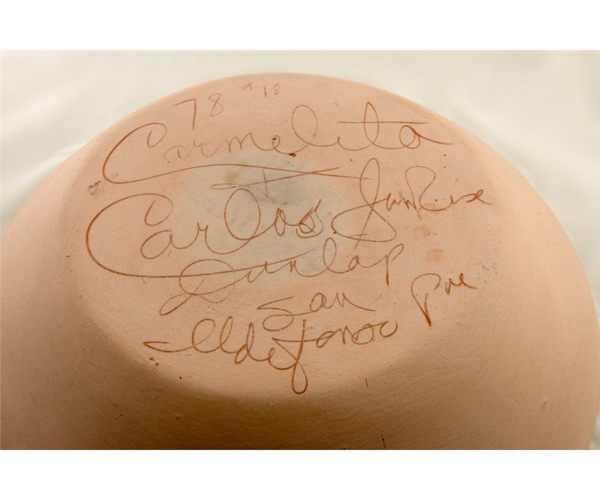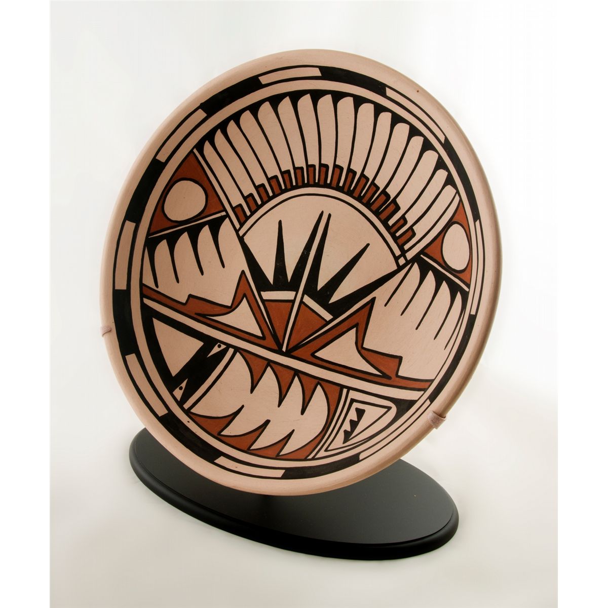 San Ildefonso Plate. 15" diameter, 3.5" deep. By Carmelita (1925 - 2000) and Carlos (1958 - 1981) Dunlap. A bold polychrome display piece with a custom stand. Signed on base: 78 #18 Carmelita & Carlos Dunlap Sun Rise, San Ildefonso Pue. Also inscribed on lower edge: Carlos and Carmelita Dunlap.