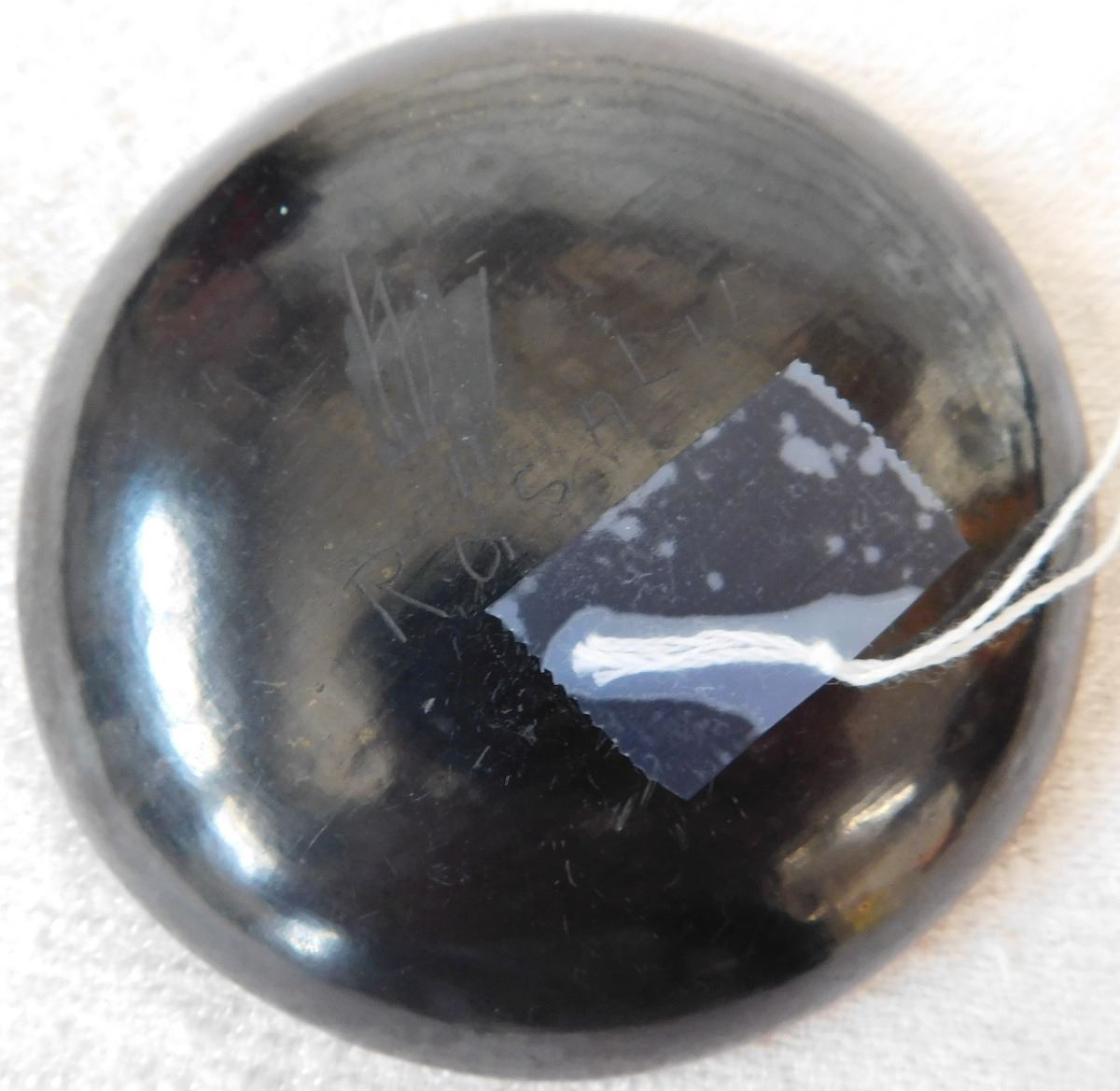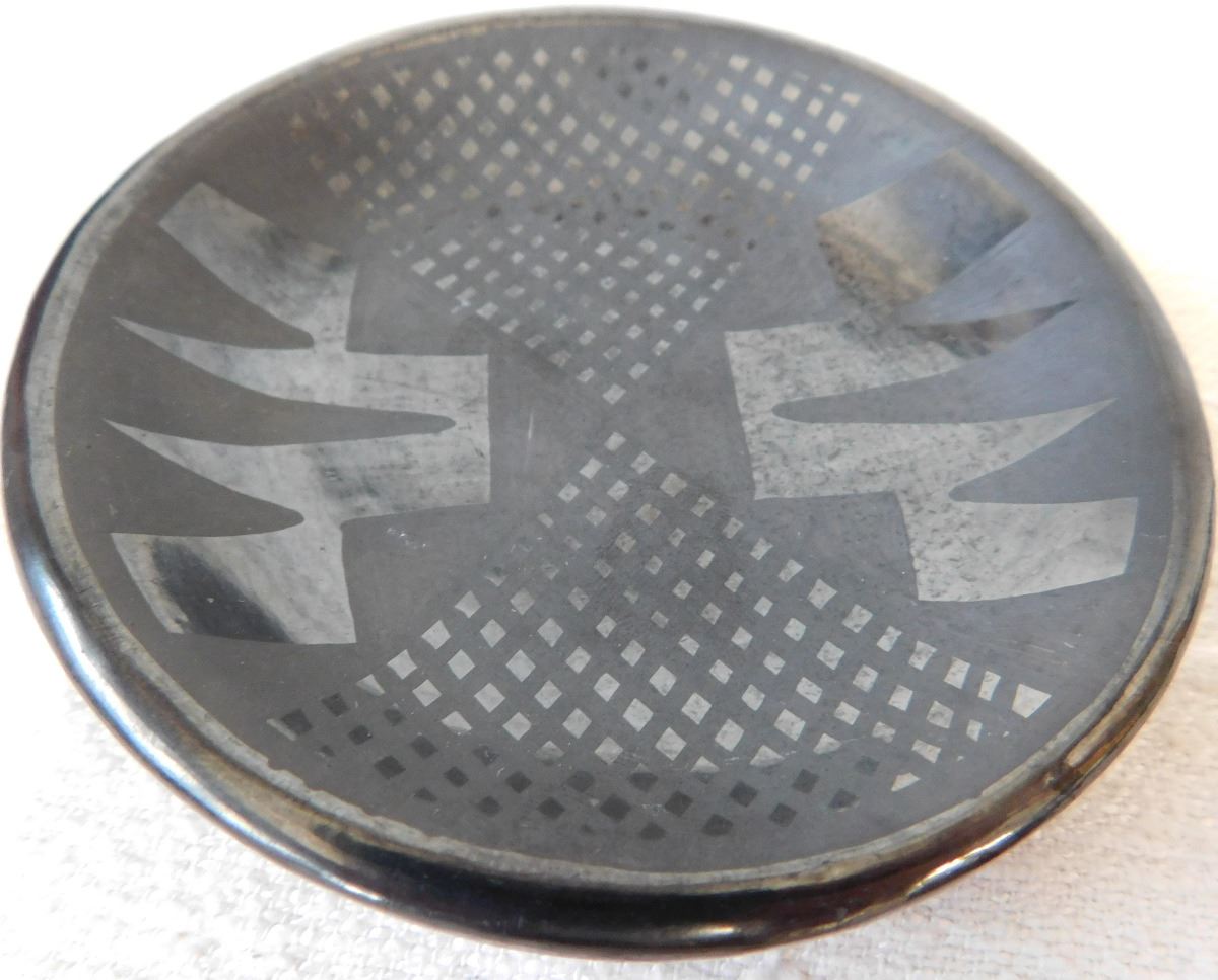 San Ildefonso Plate, circa 1950s, made of clay, this small plate measures 3 1/2 x 1 inches and is signed by Rosalie. This is a classic example of New Mexico Pueblo pottery. Condition: Good condition, see images. Shipping: $16.50, requires double-box.