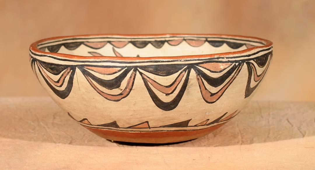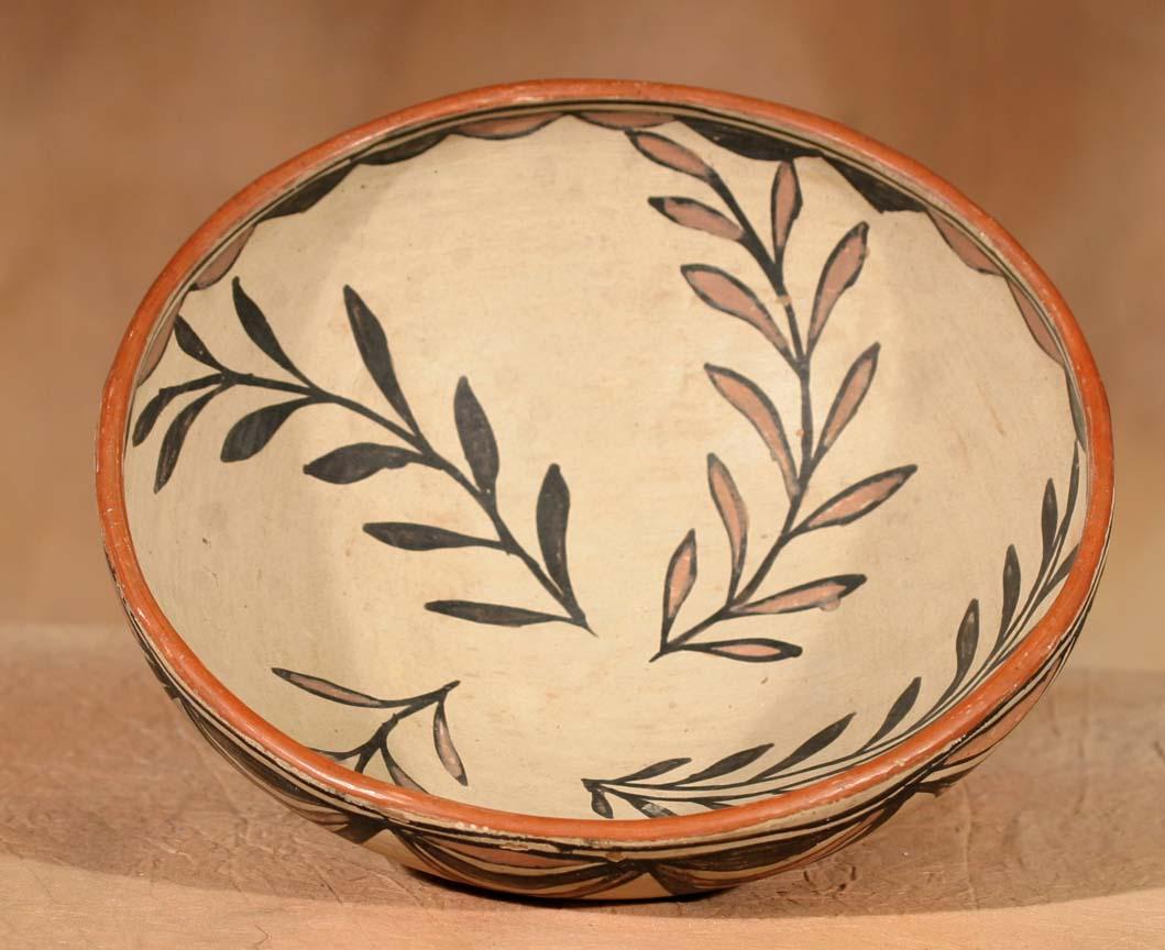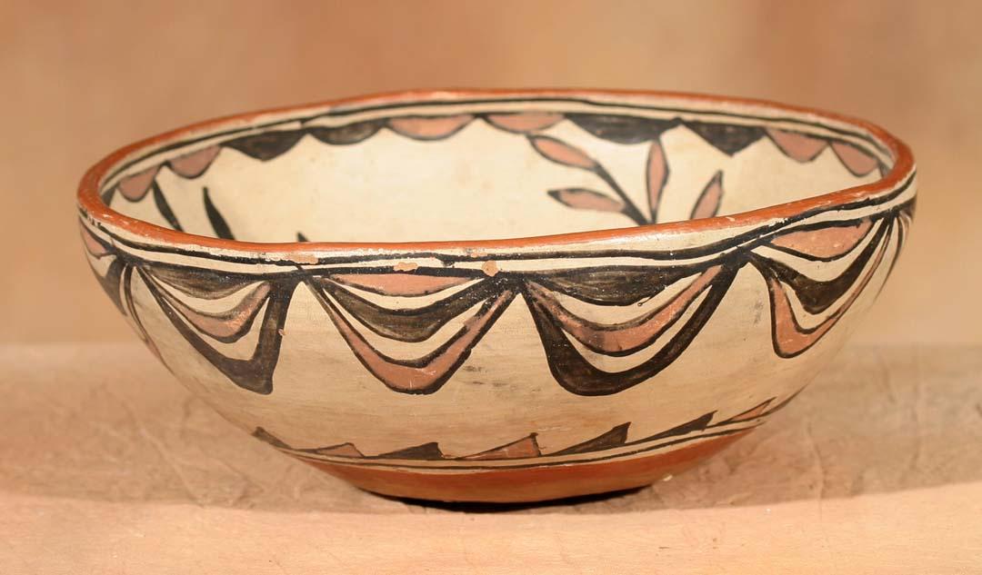 San Ildefonso Polychrome Dough Bowl. 4 ½" x 11 ½". Floral limb designs in alternating black and red. Painted exterior with secondary red rim above base. Circa 1890. (est $1,500-3,000). Provenance: Bethany College, Lindsborg, KS. For condition reports please visit: www.auctioninsantafe.com/cr2011.pdf
