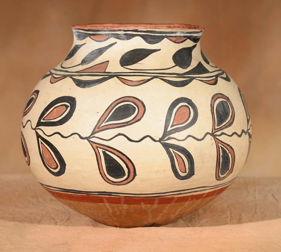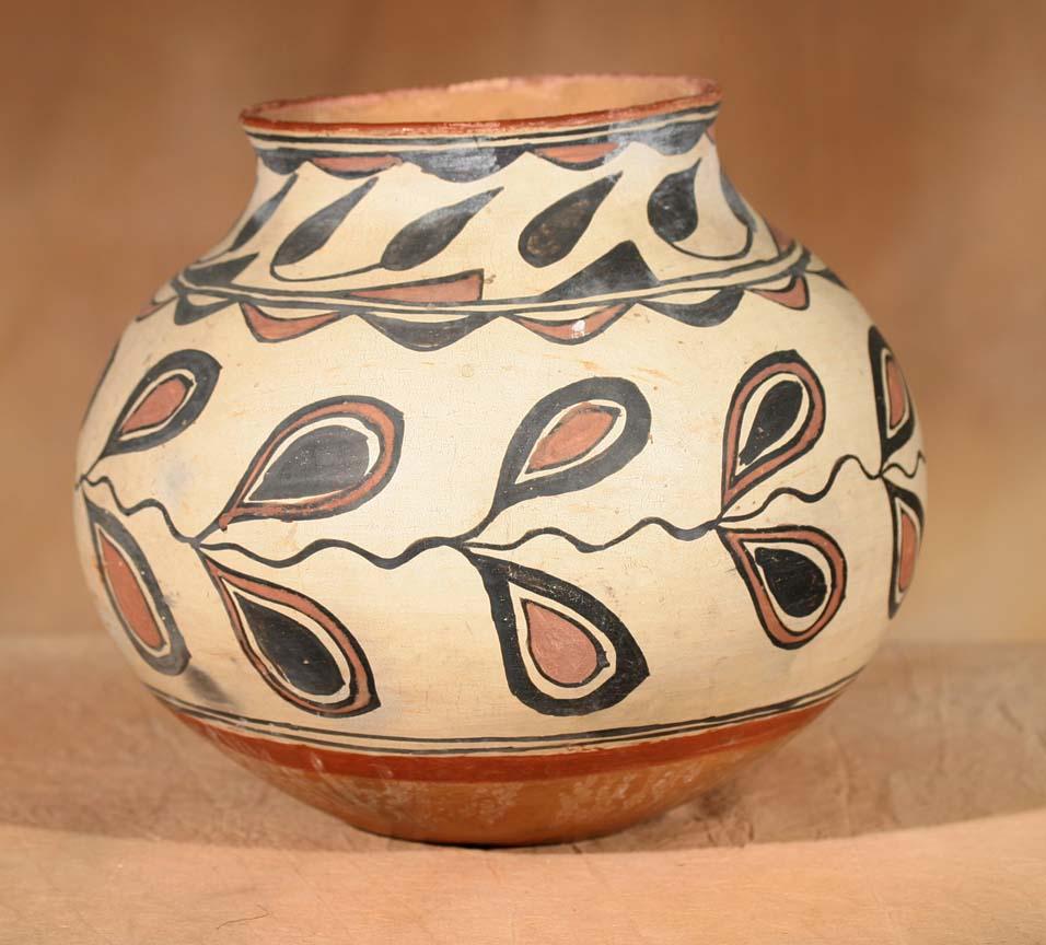 San Ildefonso Polychrome Jar. 10 ¼" x 10 ½". Secondary red band above base and a red rim. Featuring black and red leaf designs overall. Circa 1890-1900. (est $3,500-5,500). Provenance: Bethany College, Lindsborg, KS. For condition reports please visit: www.auctioninsantafe.com/cr2011.pdf