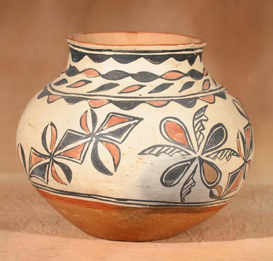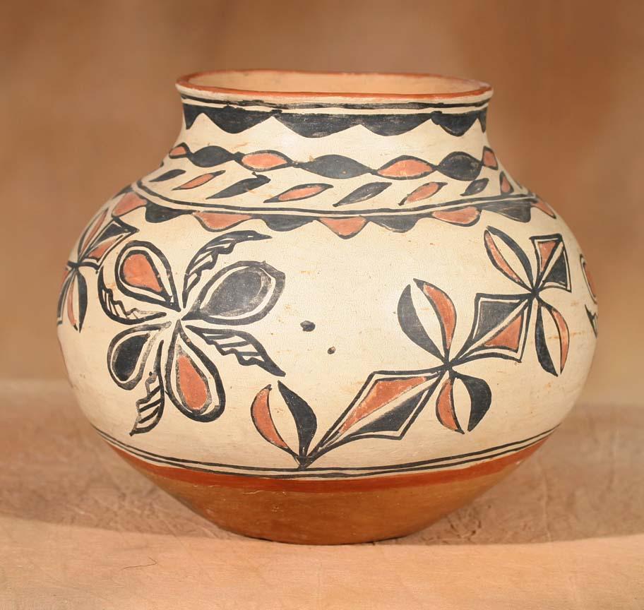 San Ildefonso Polychrome Jar. 8 ¾" x 9 ½". Featuring secondary red band along base and a red rim. Abstract floral designs in alternating black and red. Circa 1895. (est $2,500-4,000). Provenance: Bethany College, Lindsborg, KS. For condition reports please visit: www.auctioninsantafe.com/cr2011.pdf