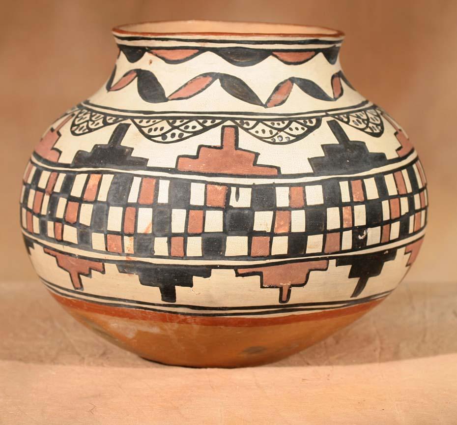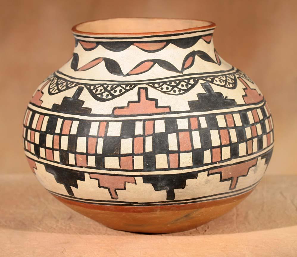San Ildefonso Polychrome Jar. 10" x 10". Featuring checkerboard, tableta and cloud designs, alternating black and red. Secondary red band above base and red rim. Circa 1895. (est $1,000-2,000). Provenance: Bethany College, Lindsborg, KS. For condition reports please visit: www.auctioninsantafe.com/cr2011.pdf