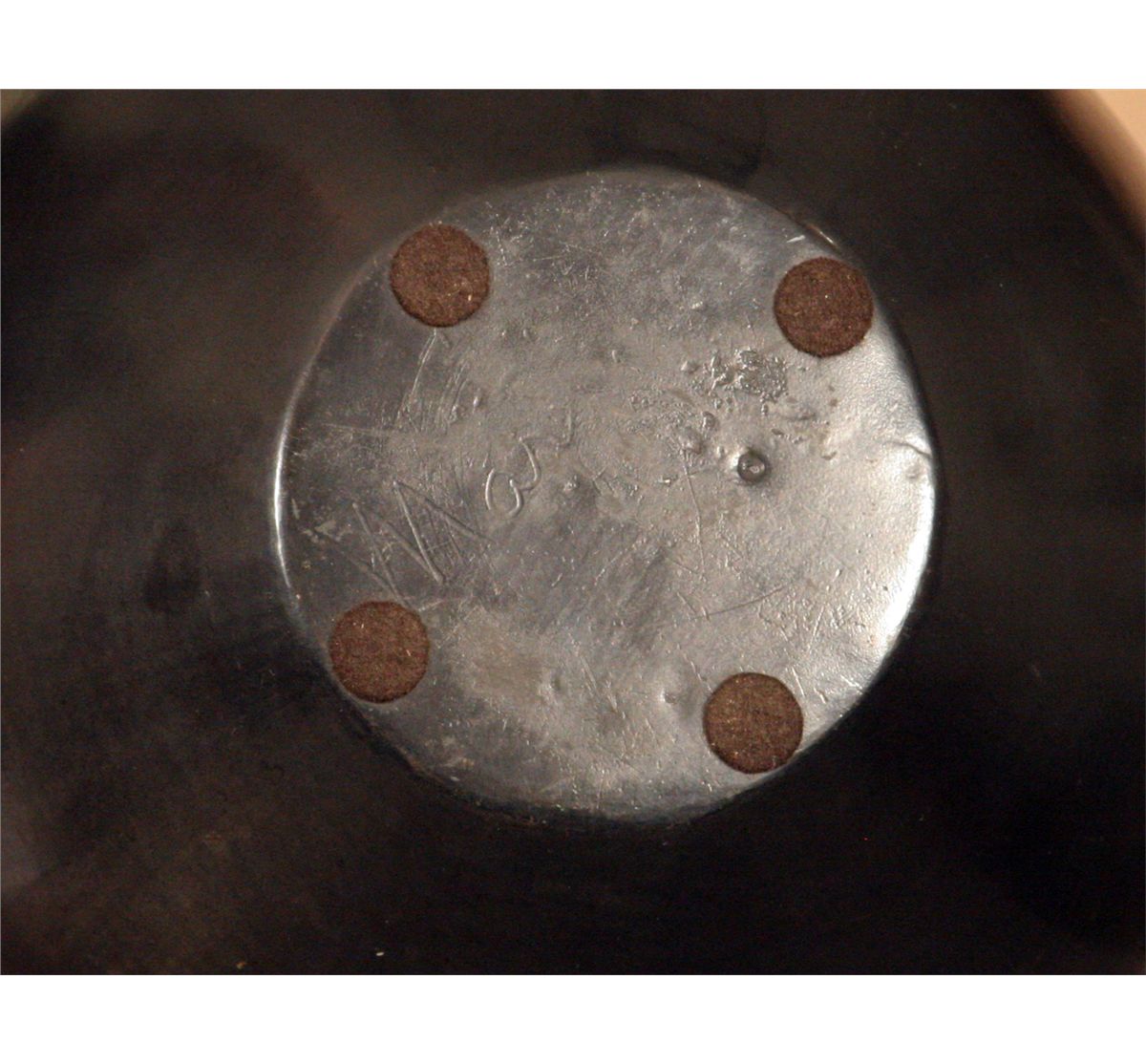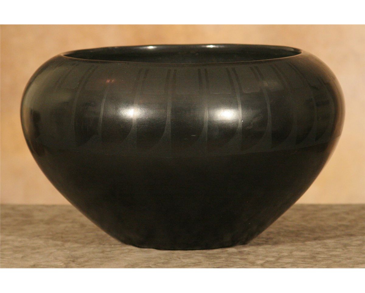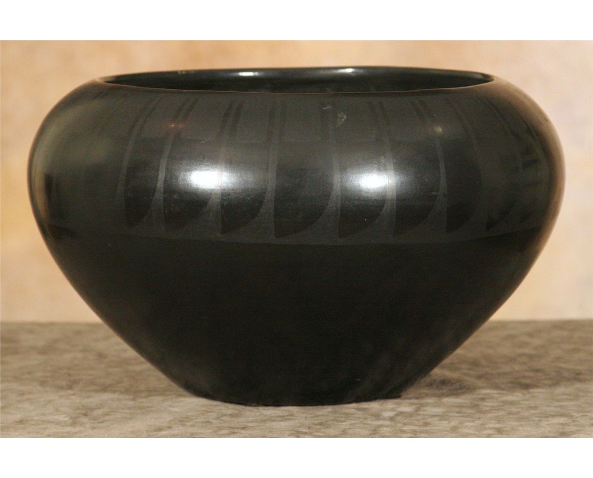 San Ildefonso Pot by Maria Martinez (1887 - 1980). 7.75" x 12" black on black pot decorated on the shoulder with feathers.