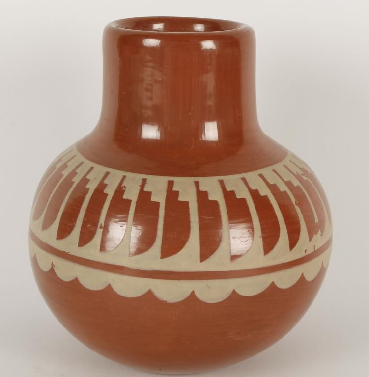 Circa 1960's. Red and beige. Signed "Helen Gutierez San Ildefonso Pueblo" on base. 6-1/2" high x 6" diameter. Shows wear.