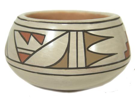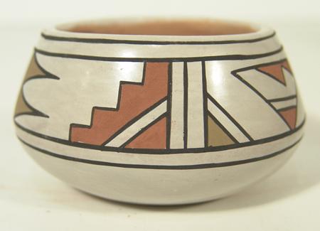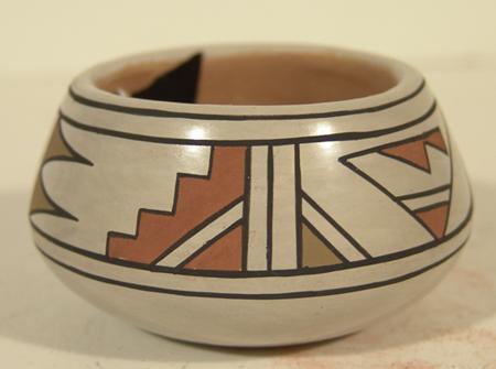 Small unique-style gray slip bowl with polychrome designs. Condition: very good.