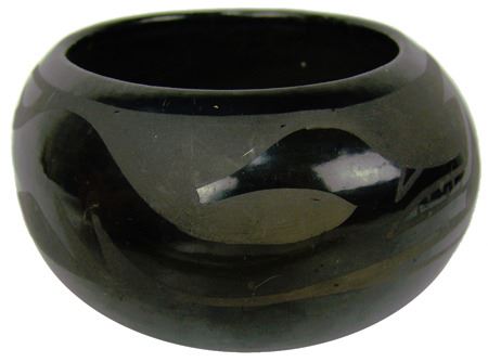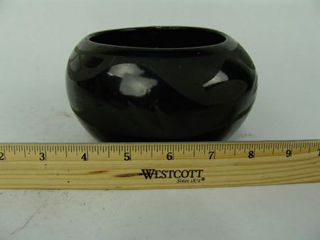 Mid 1900s, Traditional black-on-black pottery bowl with classic Avanyu serpent band. Good condition, minor surface scratches. Unsigned. 3-3/8" x 5-3/4"