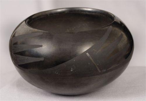 San Ildefonso Pottery Bowl. 2 ¾” x 4 ¾”. Black on black designs. Signed Marie and Julian. Minor scrapes. One small rim chip. Otherwise fine. (est $1,500-2,500)