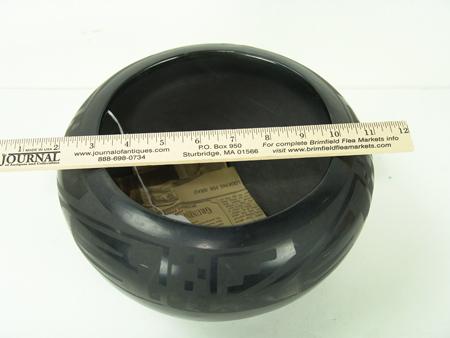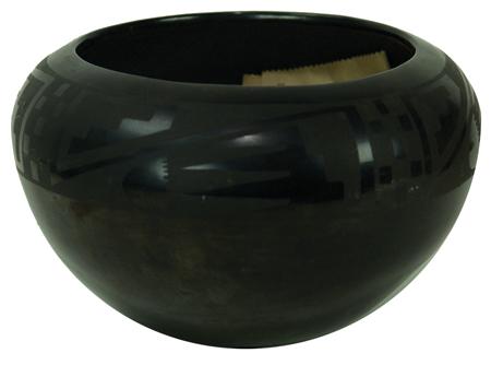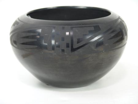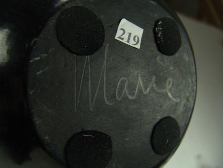 Circa Mid 1900s, Larger black-on-black pottery jar with geometric design band around shoulder. Very good condition with a few minor scuffs on the paint, signed "Marie." 6" x 9-1/2" From the Burks Collection.