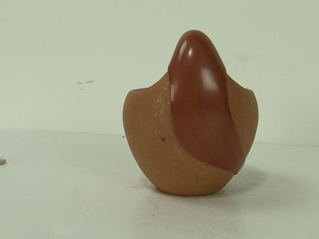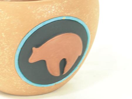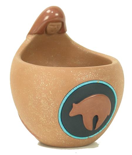 Circa 1980s, Very fine original design mica clay friendship pot with glazed head and bear figure and round of inlaid turquoise heshi beads. Very good condition, signed. 5" x 4-1/4"