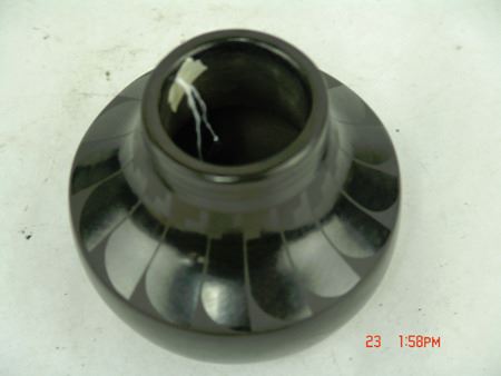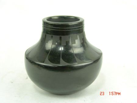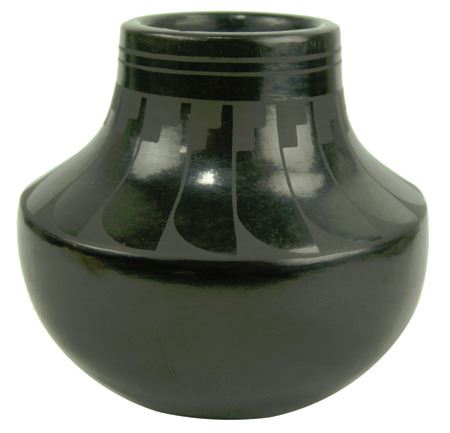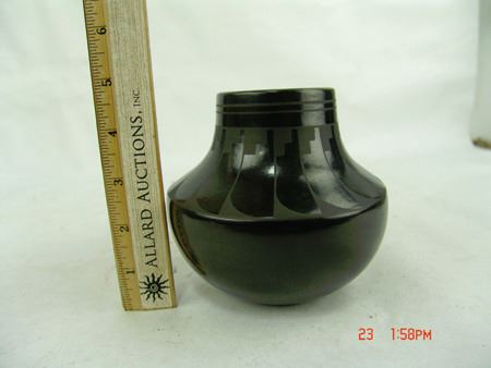 Ca. 1980s, Small matte black-on-black pottery jar with wide radiating feather design. Ruben is Alice's son and they have been collaborating since the '80s. Very good condition. Alice is Maria's granddaughter. 5-1/2" x 5-1/2"