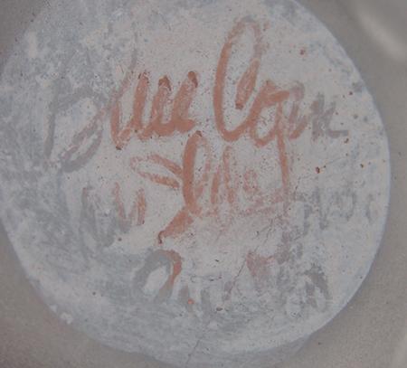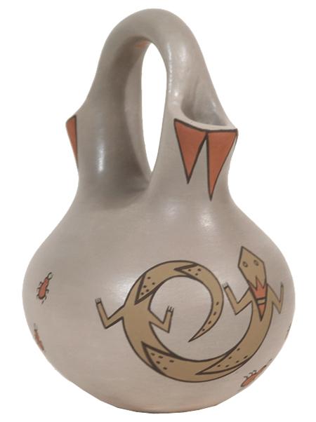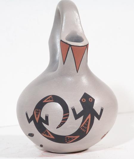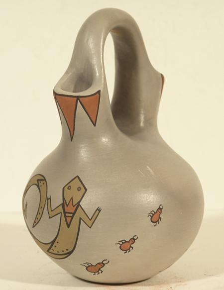 Rare wedding vase-style pottery vessel with different colored lizards on each side - done in her unique style. Purchased from maker in 1974 for $400; appraisal value $3500. Condition: very good. 8-1/2" high x 6" diameter