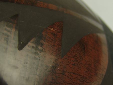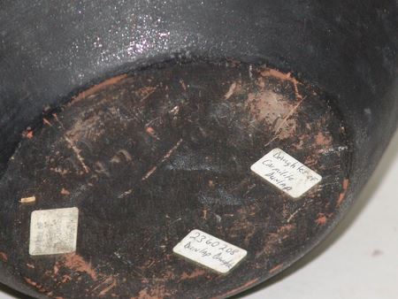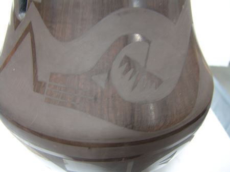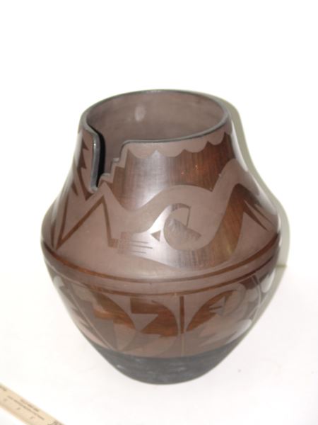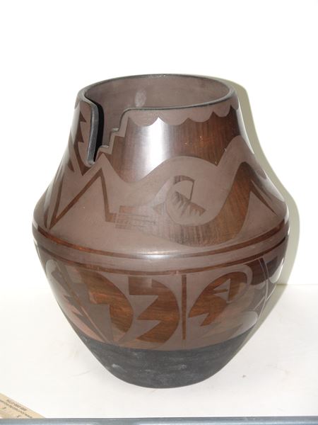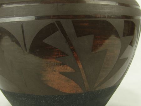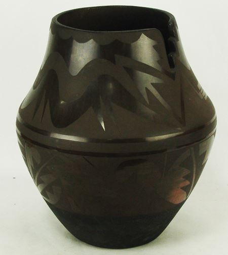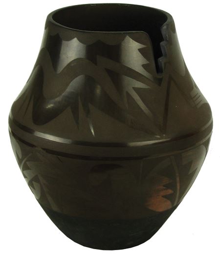 Ca. 1980s, Large and sturdy black-on-black pottery jar with stepped rim cut-out. Good condition, shows some handling, light scuffs. Martha is Carmelita Dunlap's daughter. 12-3/4" x 10"