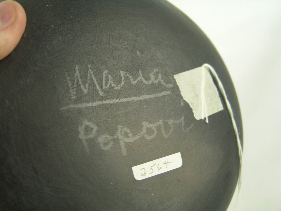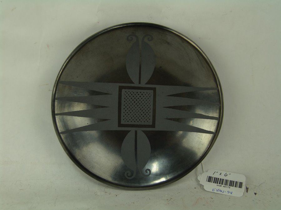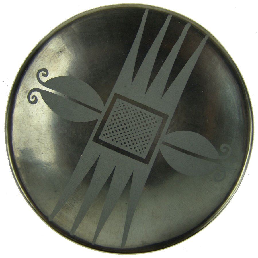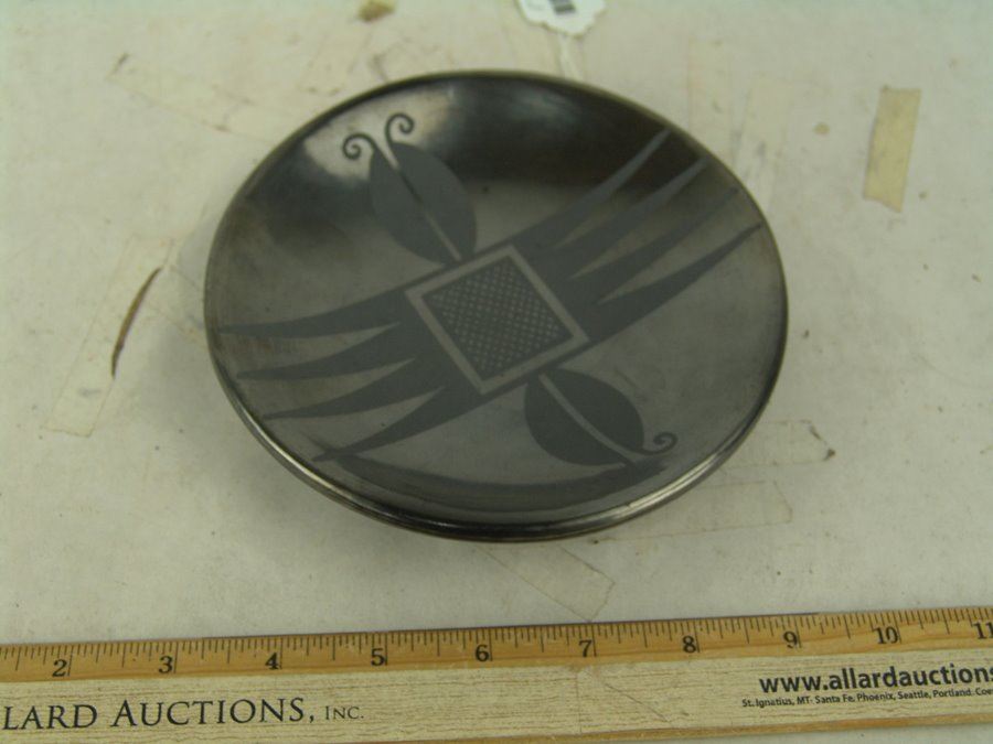 Small traditional black-on-black potter plate with simple bug (?) design. Done by Maria Martinez (1887-1980) and her son Popovi Da (1923-1971). Very good condition. **Lots #71-75, 101-105, 571-575, & 601-615,Mid 1900s,1" x 6"