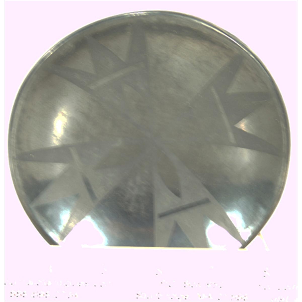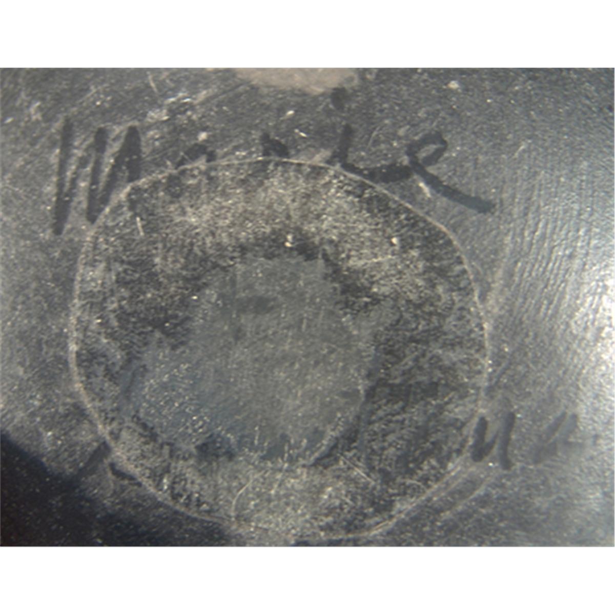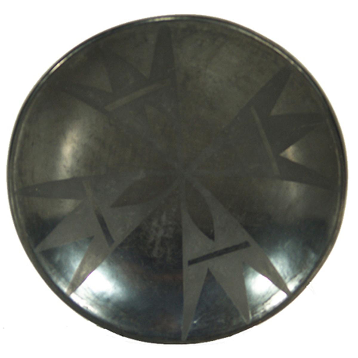 Small black-on-black pottery plate with four-sided geometric design. Signed. Condition: very good. 5-1/2" x 1"