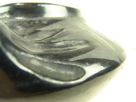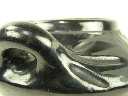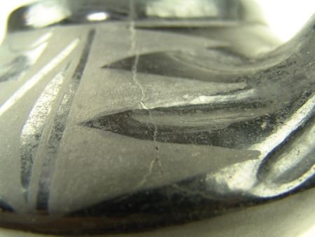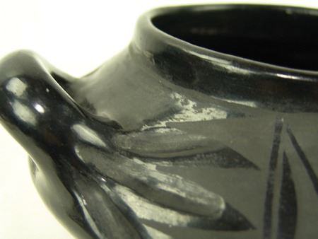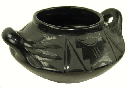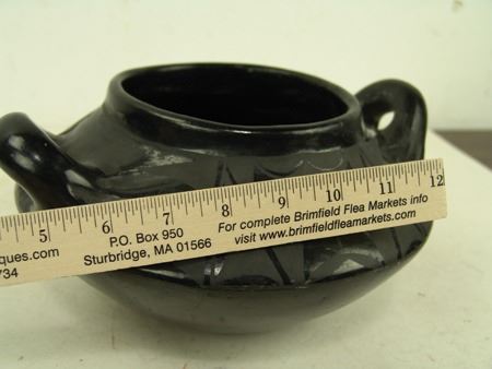 Ca. 1940s, Unique, wide, black-on-black vessel with heavy lugs and simple curvilinear designs. Good condition, has repaired crack/chip on rim. 5" x 10-1/4"