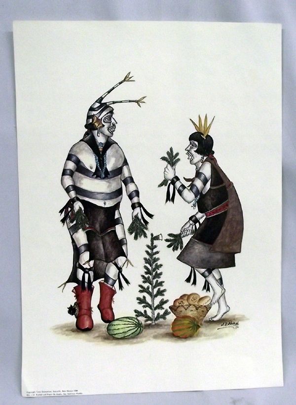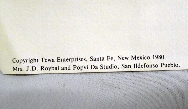 San Ildefonso Print by J. D. Roybal. Measures 11x15. Jose Disiderio Roybal (November 22, 1922 - June 28, 1978) J.D. Roybal was born in November 1922 at San Ildefonso Pueblo, New Mexico. His Tewa name was "Oquwa" which means, "Rain God." Copyright Tewa Enterprises, Santa Fe, New Mexico, 1980. Mrs. J. D. Roybal and Popvi Da Studio, San Ildefonso Pueblo.