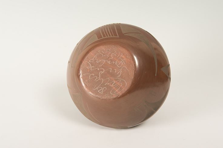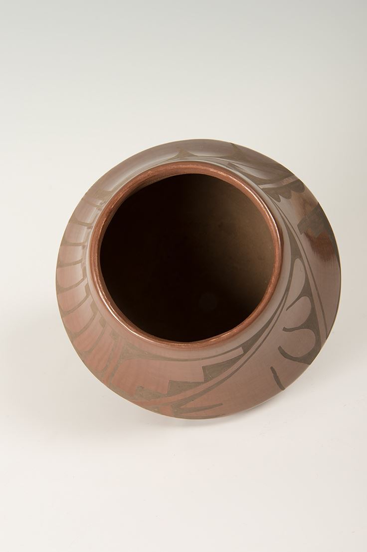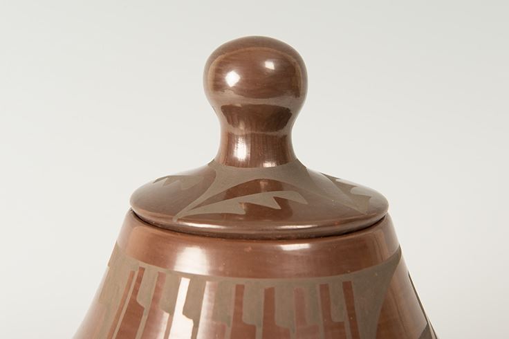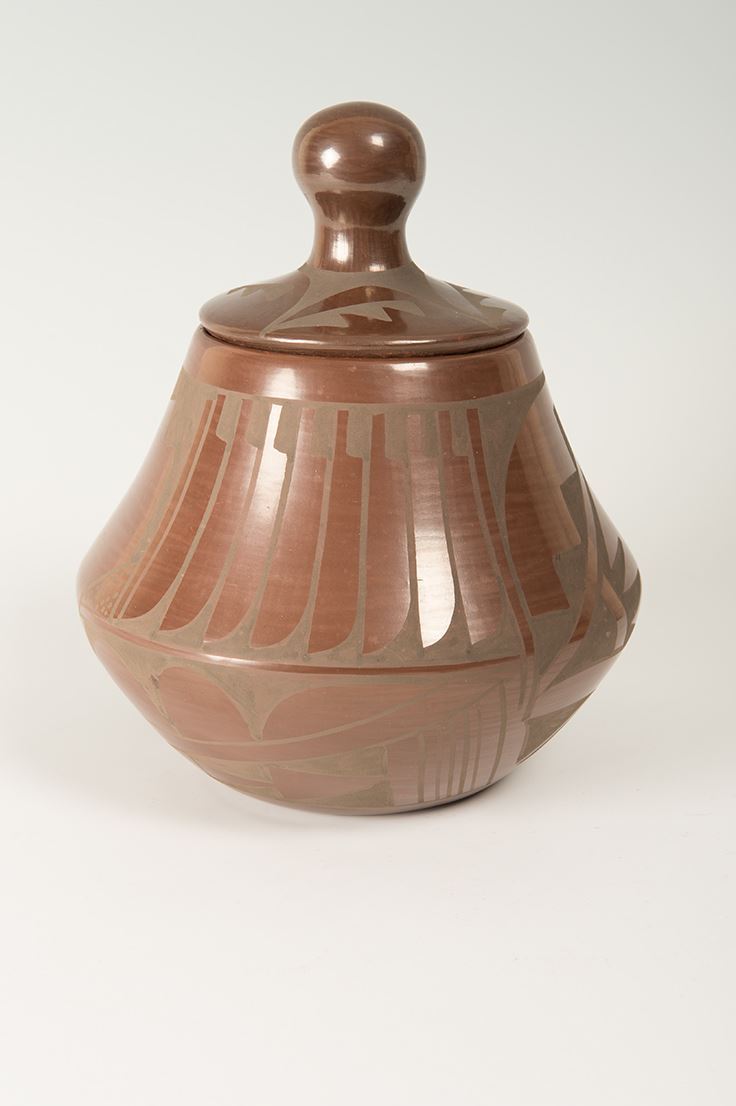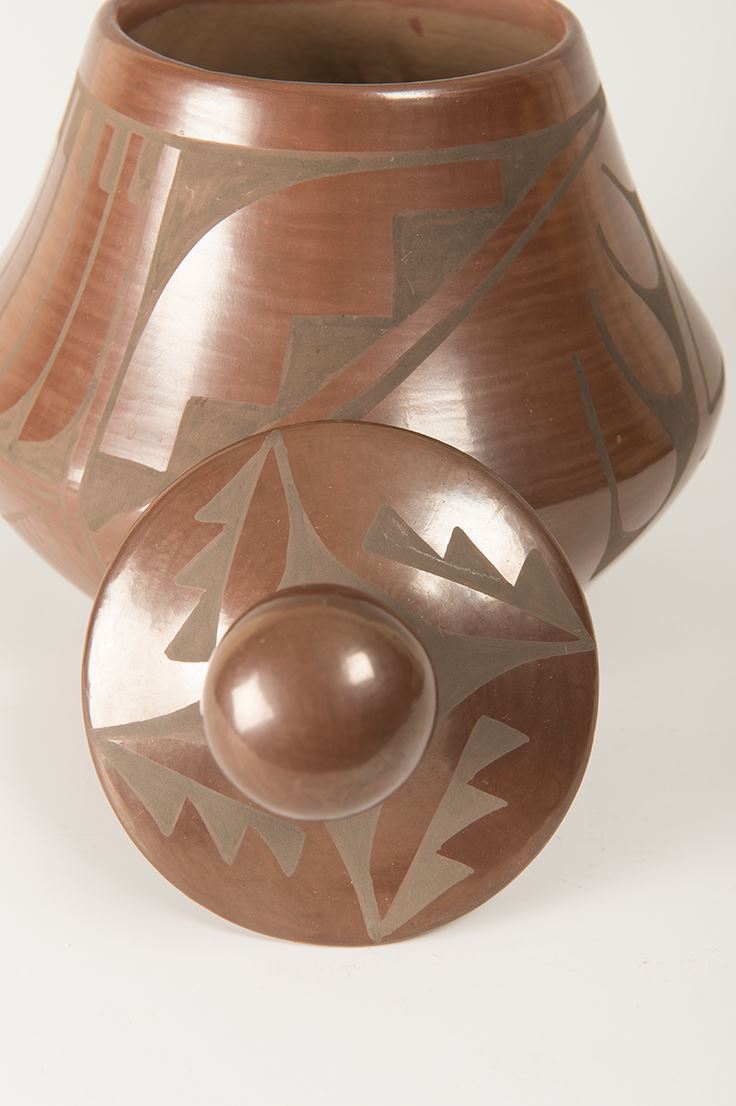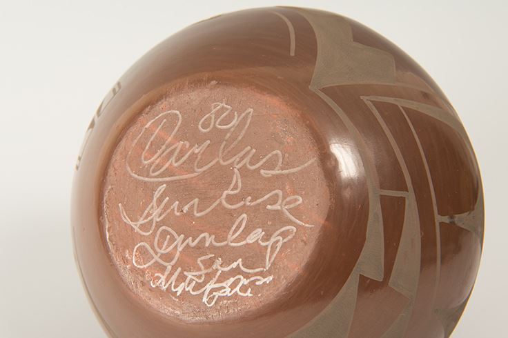 San Ildefonso Pueblo Lidded Jar by Carlos Dunlap. 9 ¾" tall including lid x 8". Creamy brown jar with traditional designs in matte black. Inside of lid is signed: Dunlap. Bottom of jar signed: Carlos Sunrise Dunlap, San Ildefonso Pueblo.