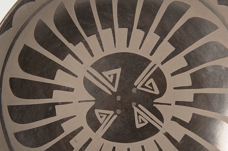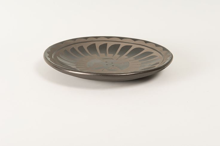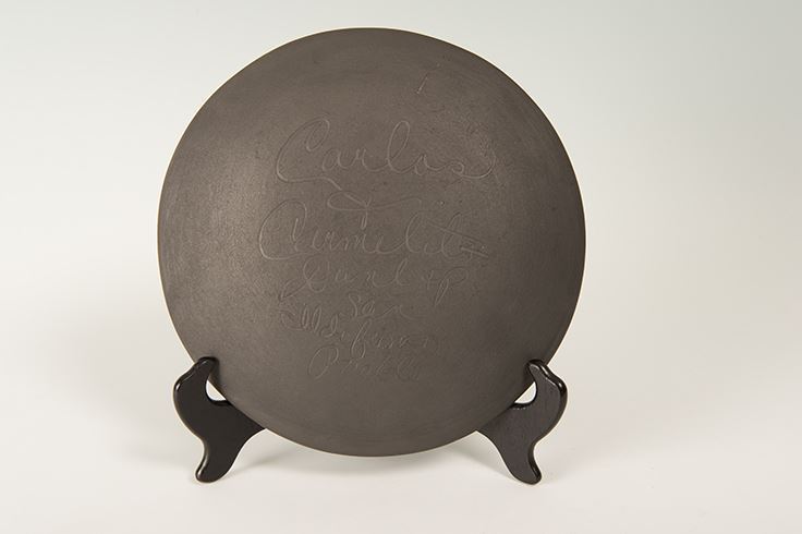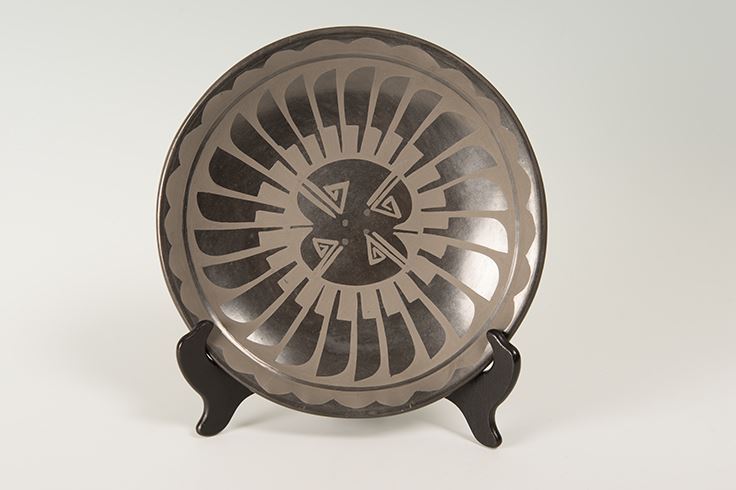 San Ildefonso Pueblo Plate by Carlos & Carmelita Dunlap. 15" feather plate with black on black designs. Signed on bottom: Carlos & Carmelita Dunlap, San Ildefonso Pueblo. Includes custom stand.