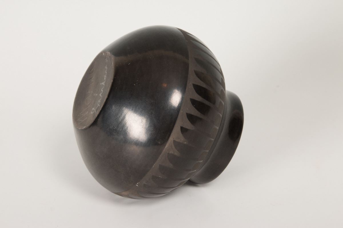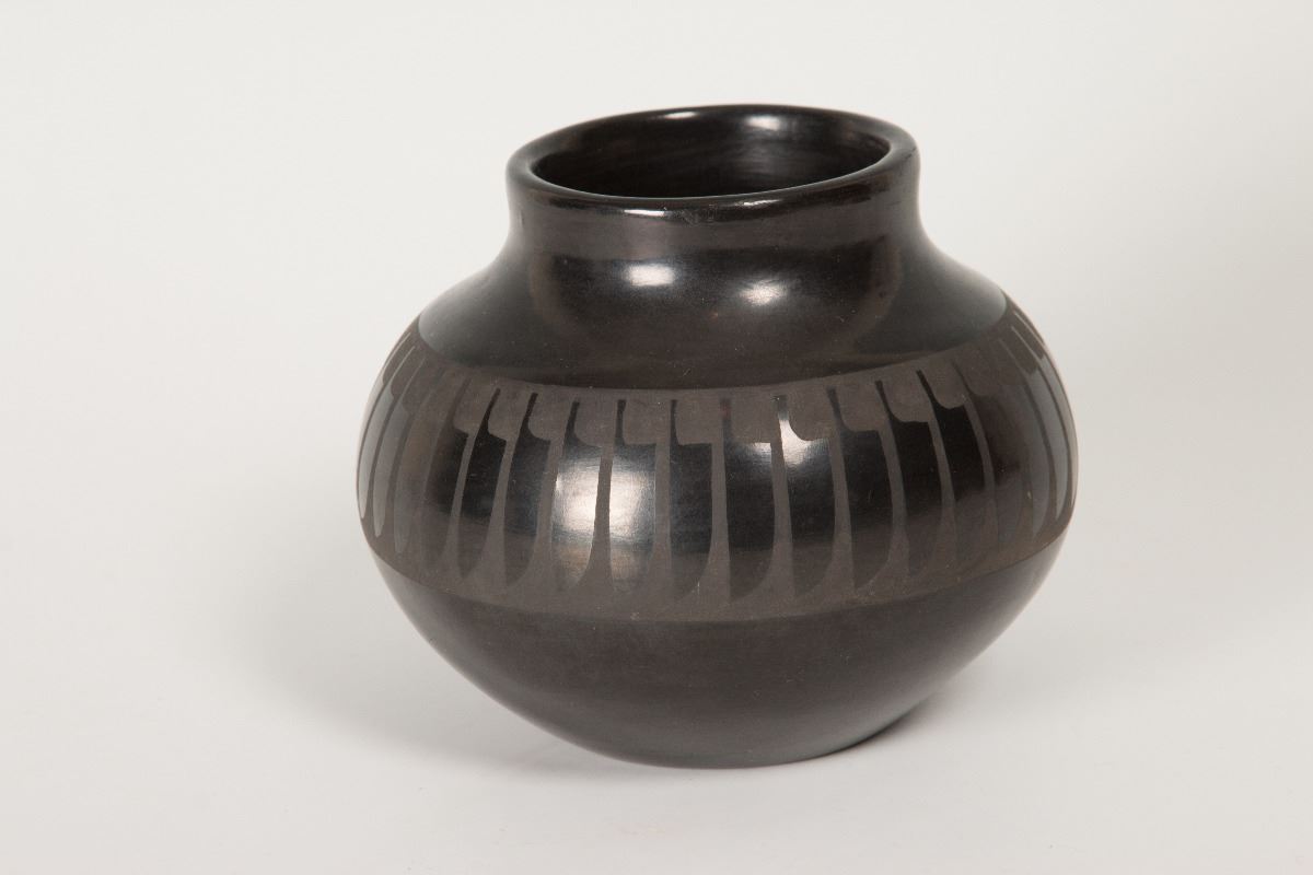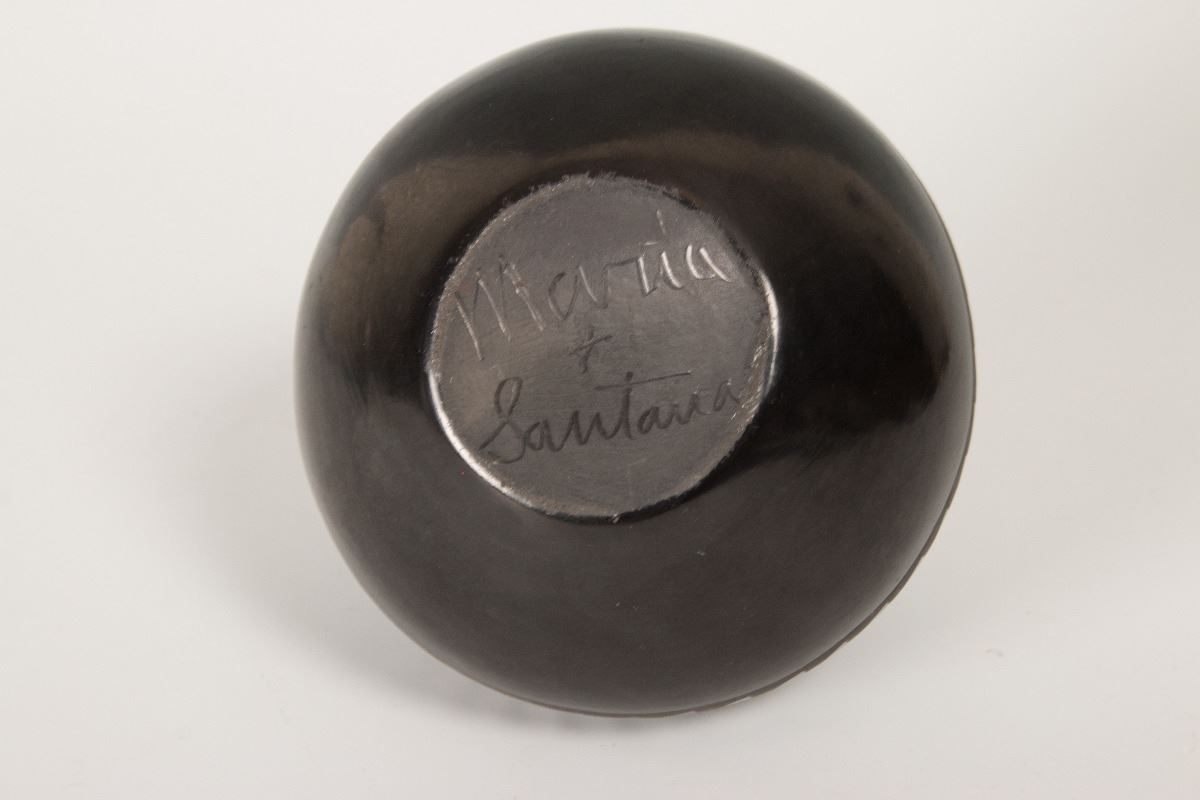 San Ildefonso Pueblo Pot by Maria and Santana. Small 4 ½" x 5 ½" blackware pot with classic eagle feather designs. Signed on bottom: Maria & Santana.