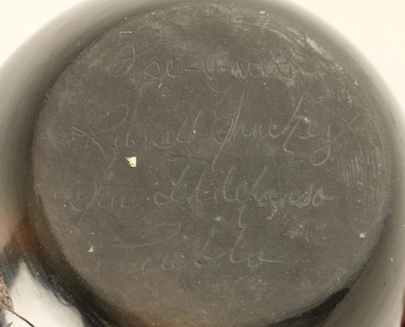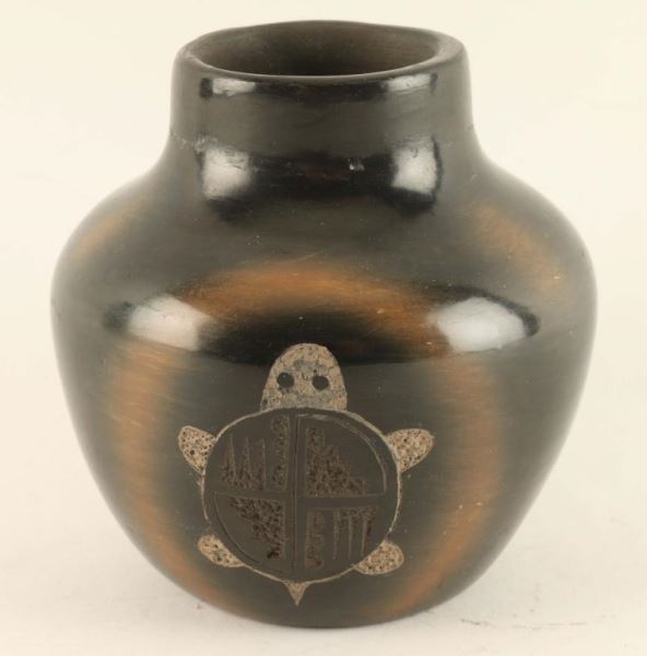 This San Ildefonso Pueblo Turtle Pottery was made by innovative & contemporary artisan, Russell Sanchez. A beautiful piece, it was hand built, fired & stone polished in a blackish-brown color. On the front, Russell scratched (scrafitto) a turtle pattern, the symbol and of good health and a long life.Very nice, it's about 4" tall and 4-1/4" wide. Offered for sale from the Phoenix Heard Museum, it has some light wear around the neck and body. Signed, we believe this is one of his early pieces, circa 1980's. This San Ildefonso Pueblo Turtle Pottery is one of a kind! Russell (1966- ) has been working clay since 1980. He is an award winning artist who's work is considered upper end and elite, and he has exhibited all over the southwest. His work is in the Museum of Indian as and Culture, Museum of Natural History LA, the Smithsonian and the Heard Museum. He is referenced in Schaaf's, "Pueblo Indian Pottery, 750 Artist Biographies" and Hayes/Blom's "Southwestern Pottery Anasazi to Zuni".