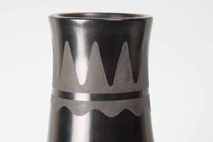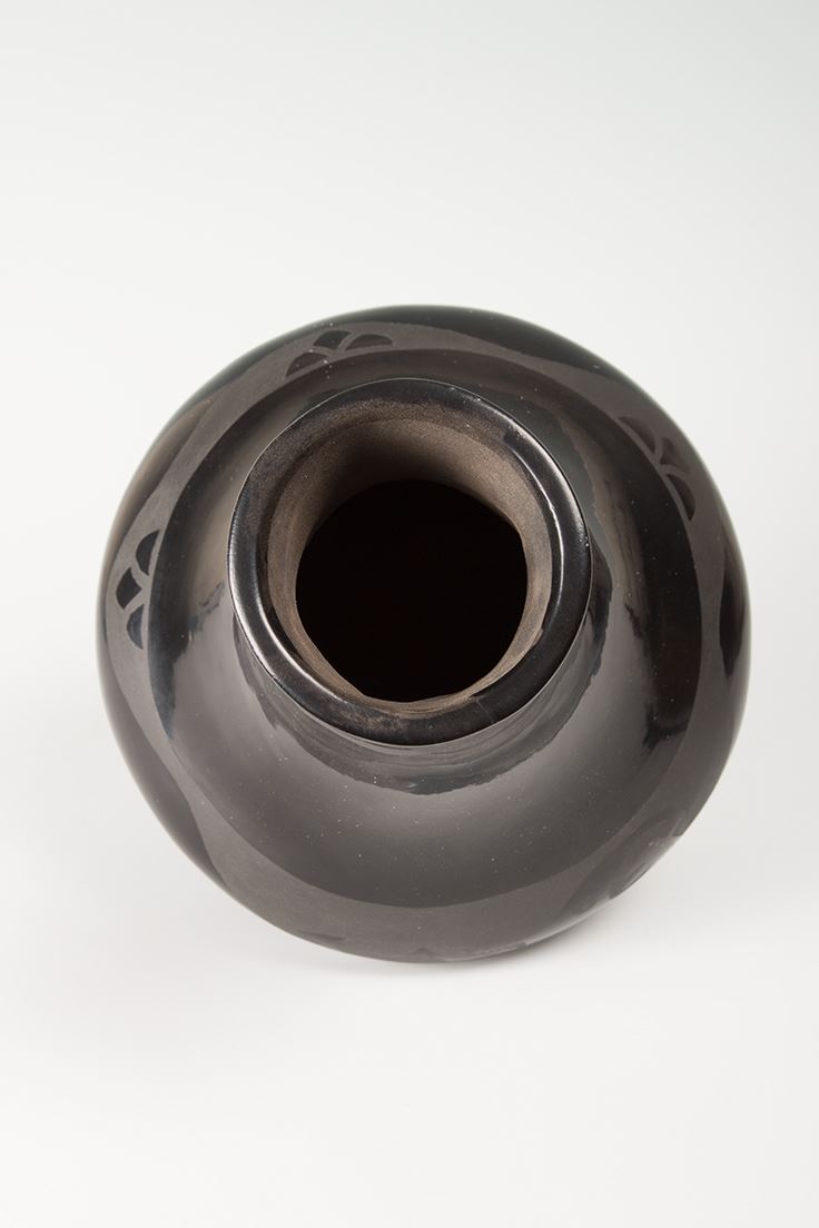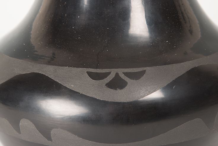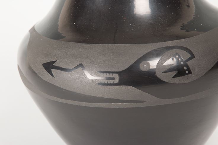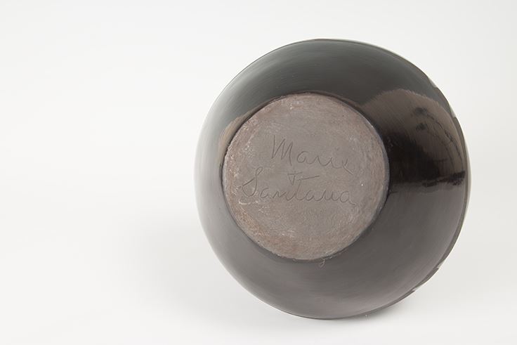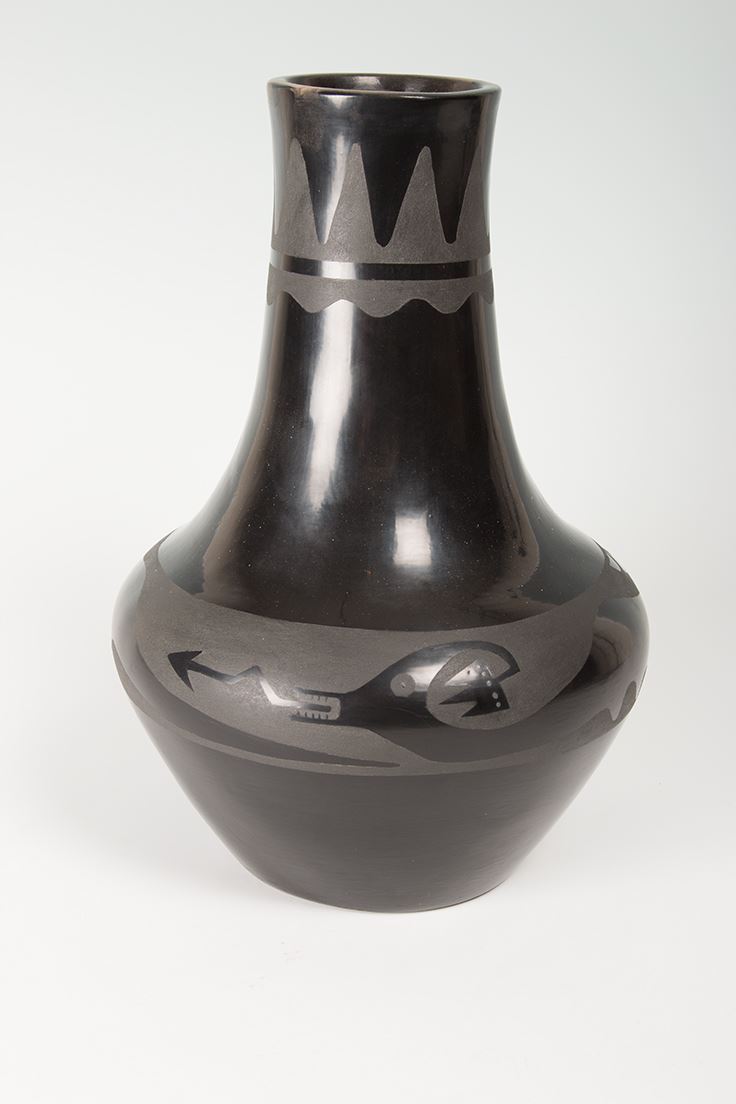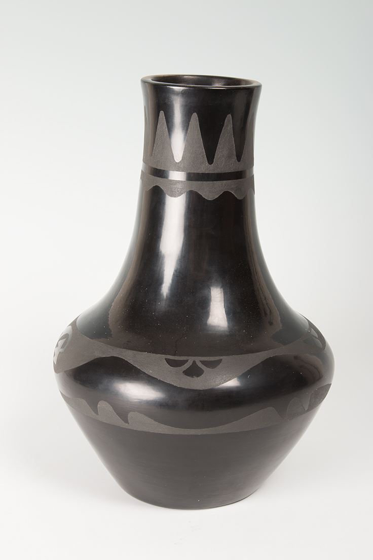 San Ildefonso Pueblo Vase by Marie and Santana (1887-1980). 12 ½" x 8 ½". Blackware jar with both polished and matte finishes. An Avanyu design wraps the jar. Signed on bottom: Marie & Santana.