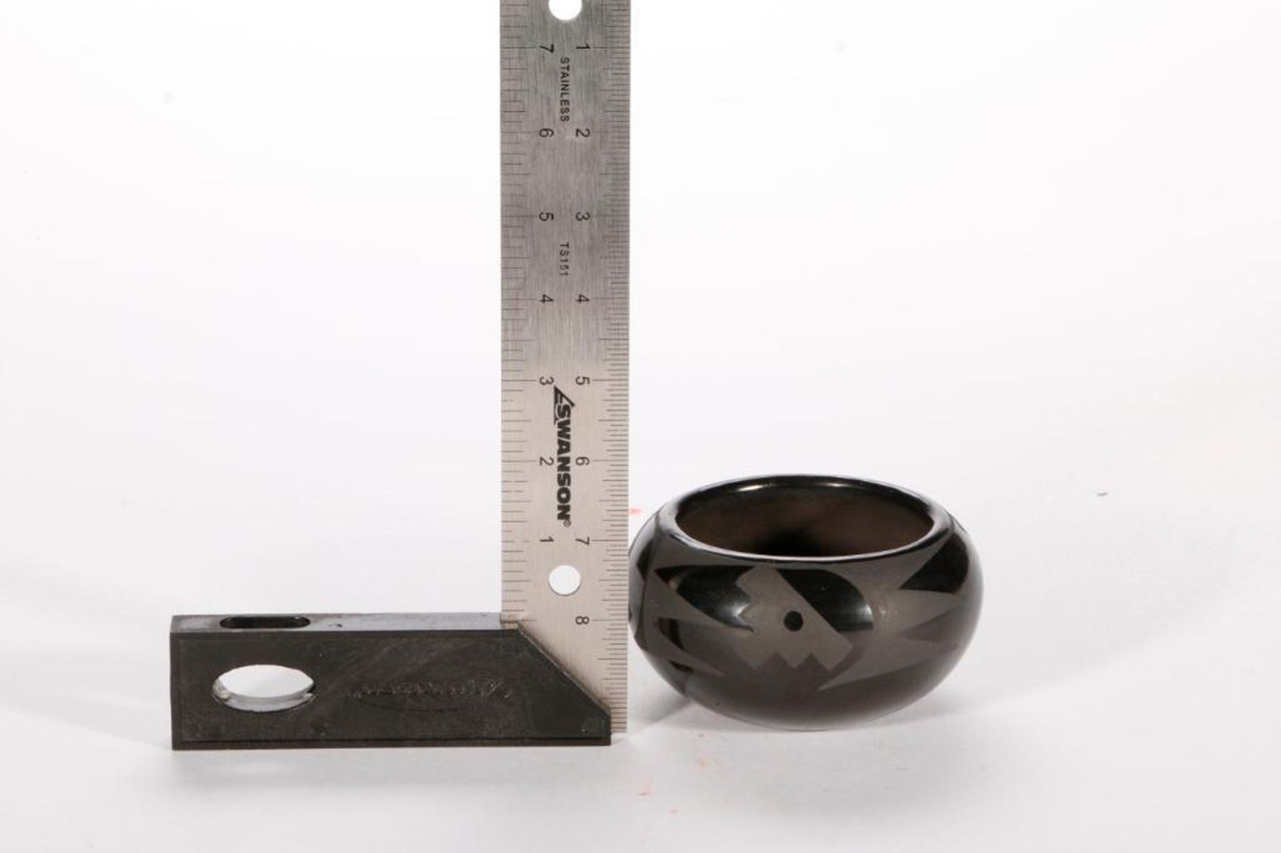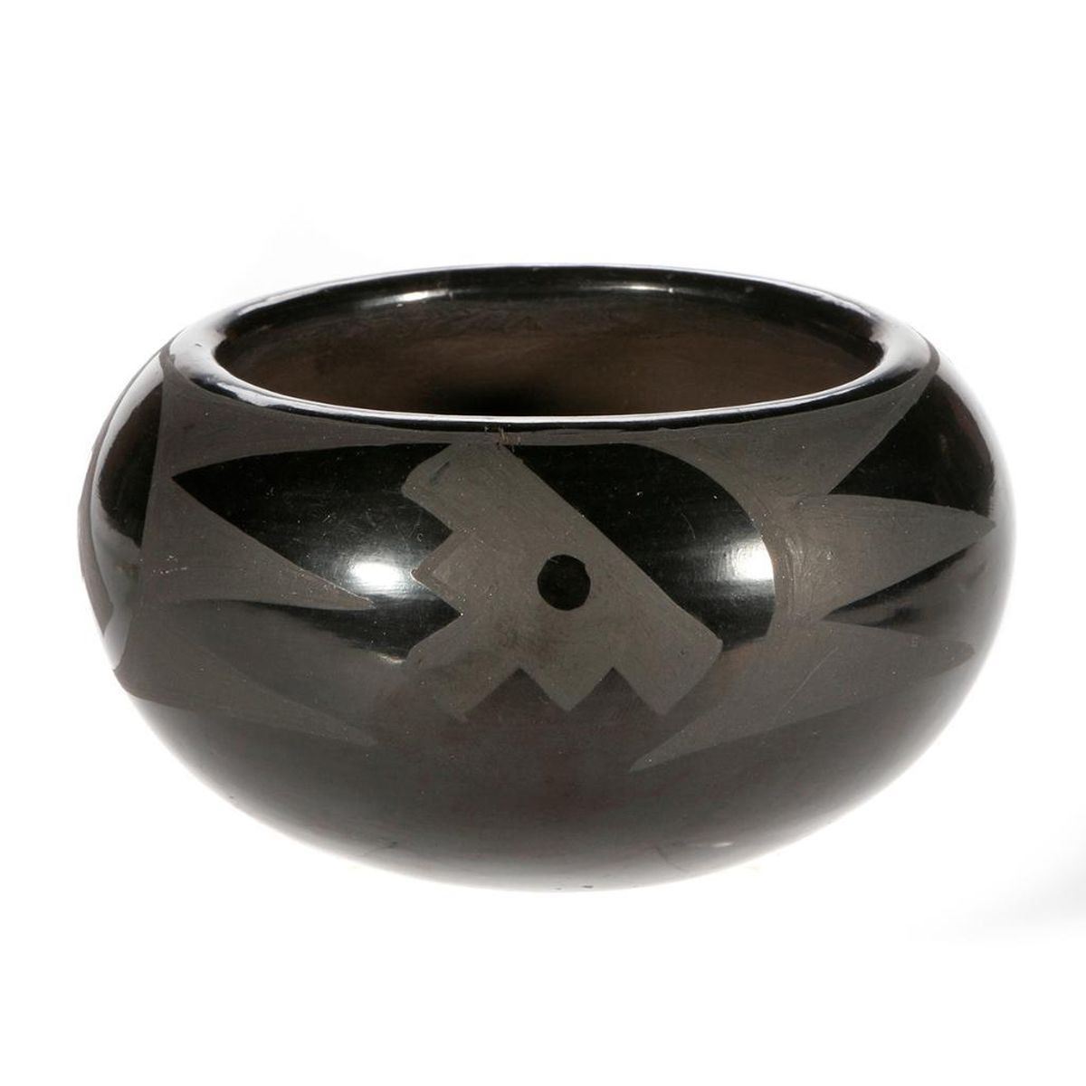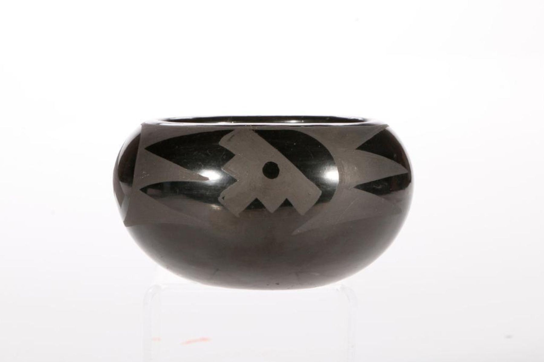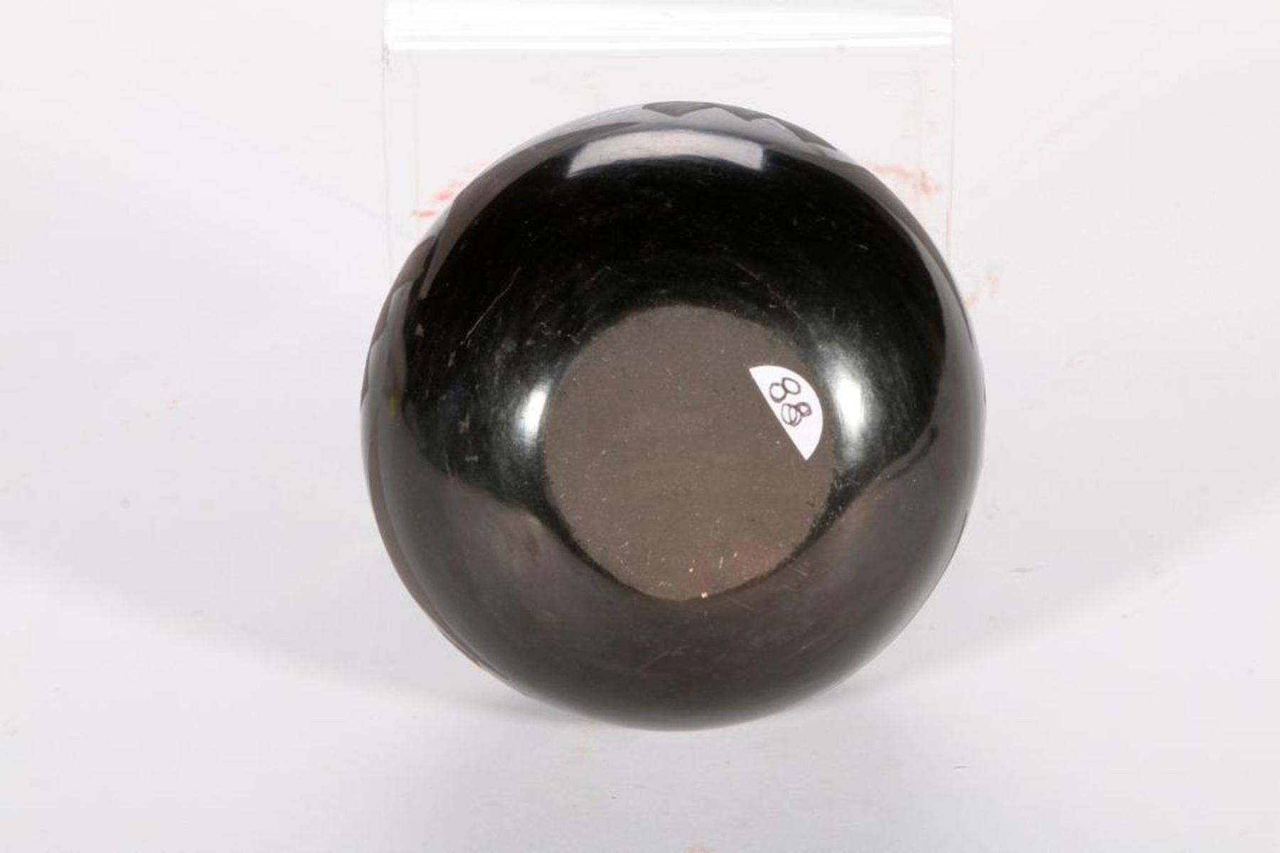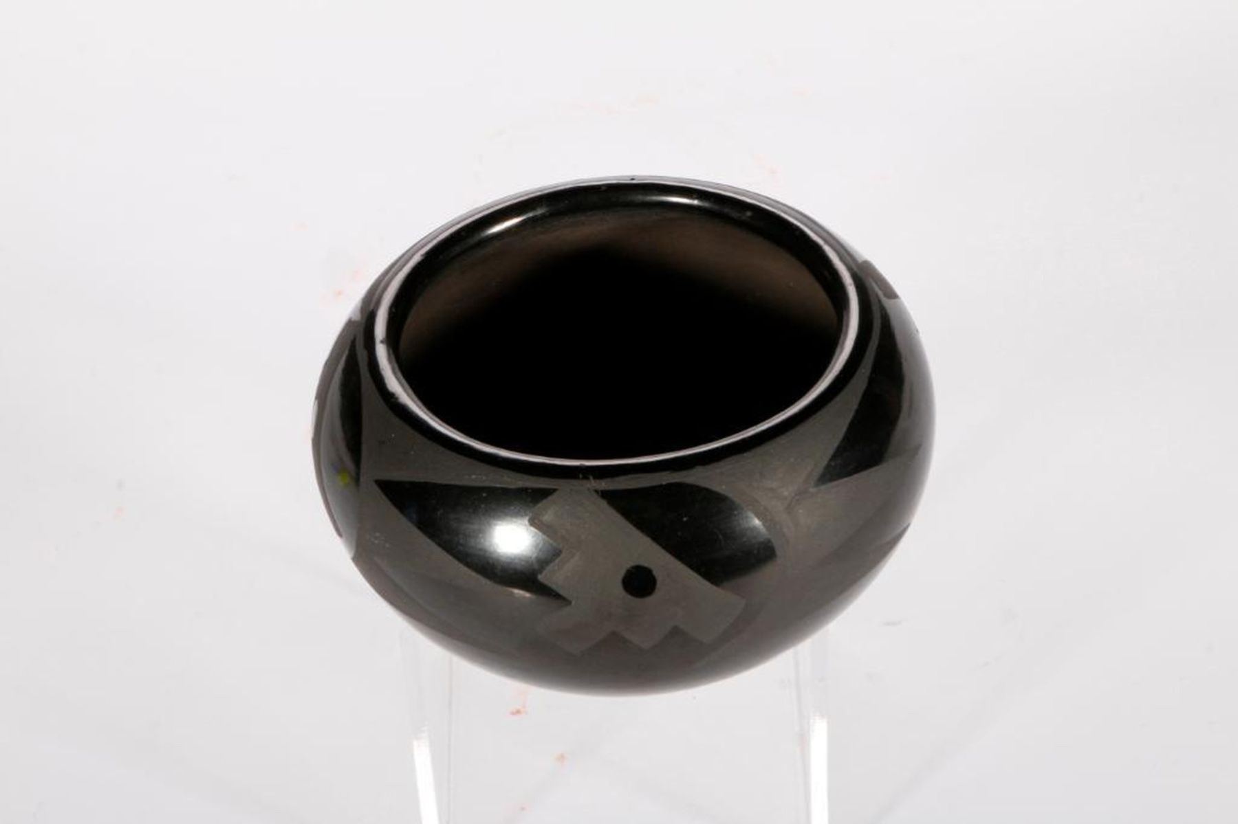 San Ildefonso (probably) bowl (2 3/8" x 4 1/4") Traditional black on black w/designs, older (vintage) bowl