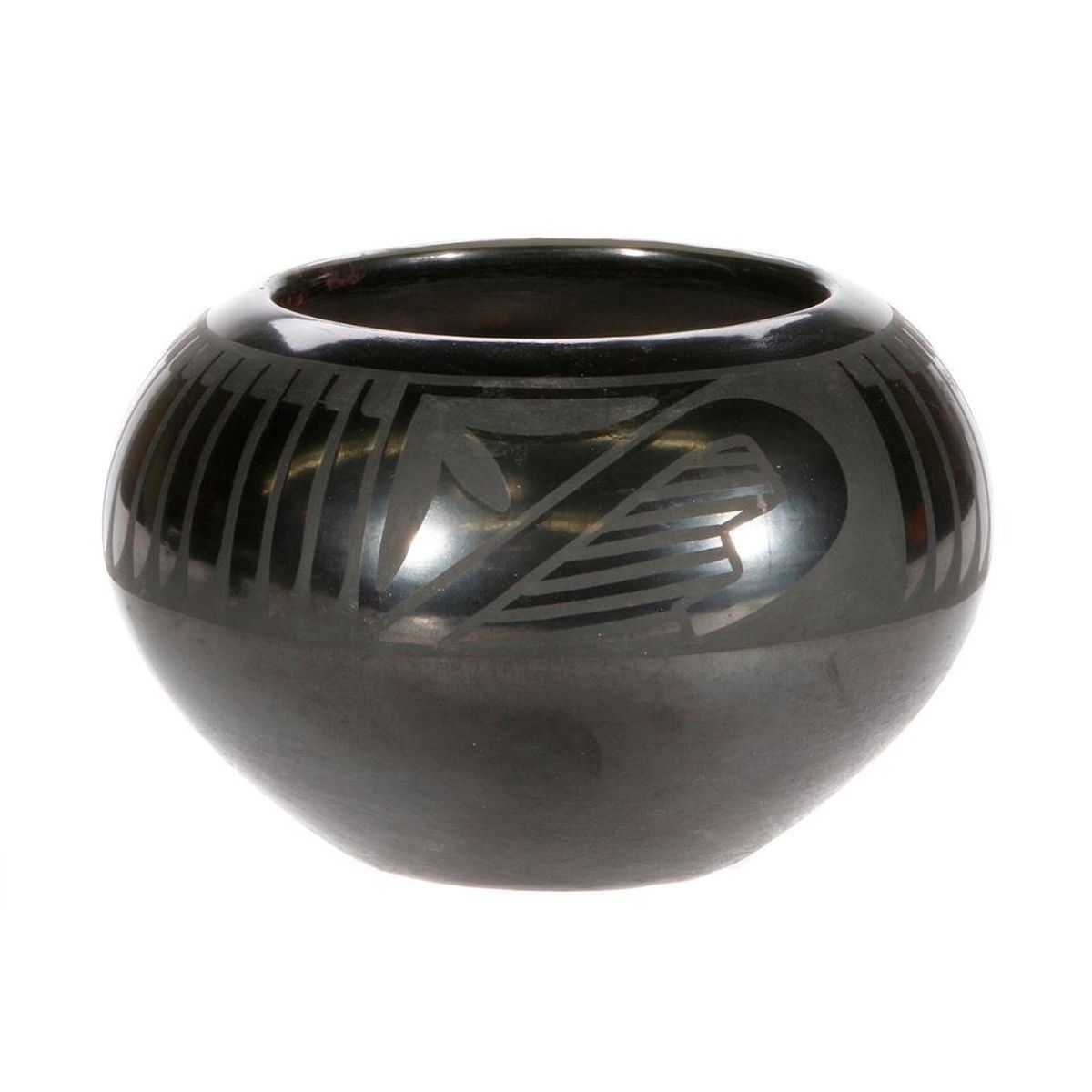 San Ildefonso bowl, (4" x 6") by Maria Martinez and Popovi Da; black on black with feather and another design, made between 1956 and 1959