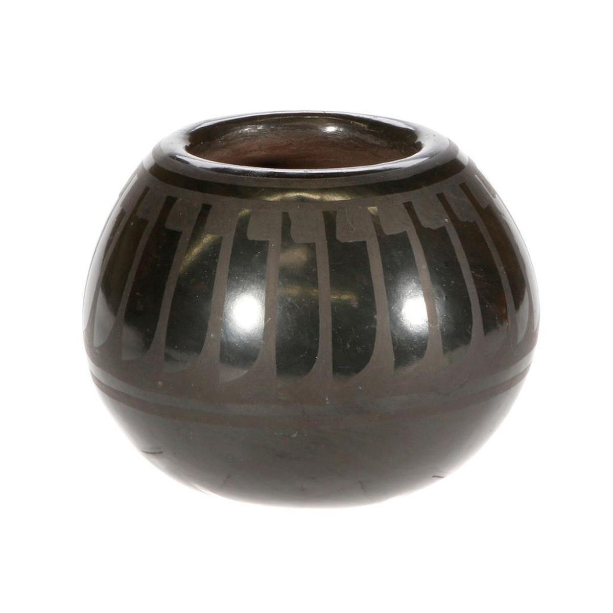 San Ildefooson bowl, (35/8" x 3") by Blue Corn (Crucita Calabaza) who lived from 1920 to 1999, traditional black on black with feather design