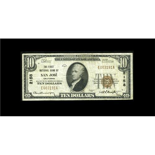 <B>San Jose, CA</B></I> - $10 1929 Ty. 1 <B>The First NB</B></I> Ch. # 2158<BR>A <B>Very Fine</B></I> northern California note still displaying considerable crispness.