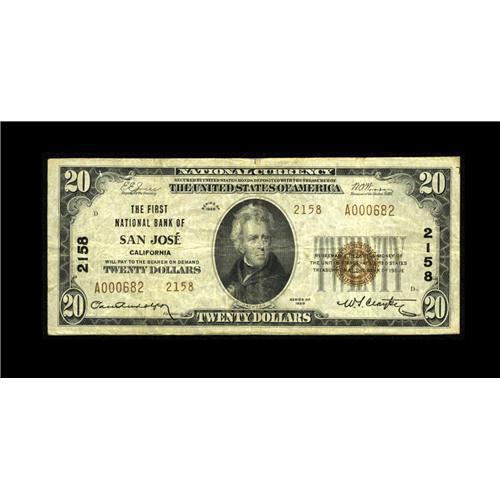 <B>San Jose, CA</B></I> - $20 1929 Ty. 2 <B>The First NB</B></I> Ch. # 2158<BR>A <B>Very Fine</B></I> note from the more modern incarnation of a one time issuer of Gold Bank Notes. The $20 Ty. 2 is an especially elusive issue from here.<BR><BR><b>Shipping:</b> Coin/Currency (<a target="_blank" href="http://www.heritageauctions.com/common/shipping.php">view shipping information</a>)