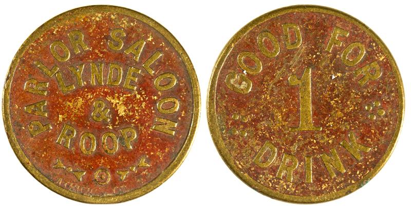 Obverse: Parlor Saloon / Lynde / & / Roop. Reverse: Good For / 1 / Drink