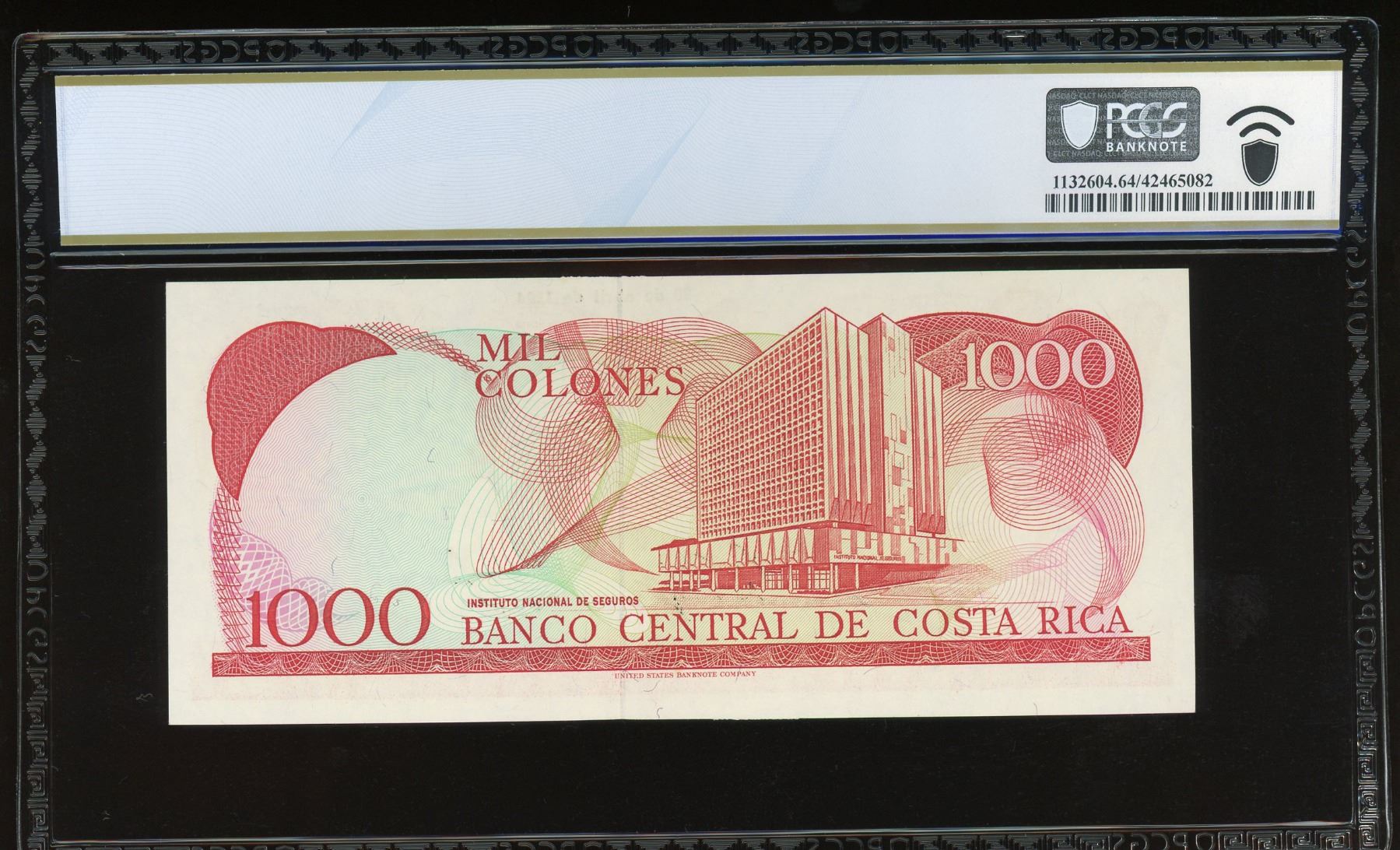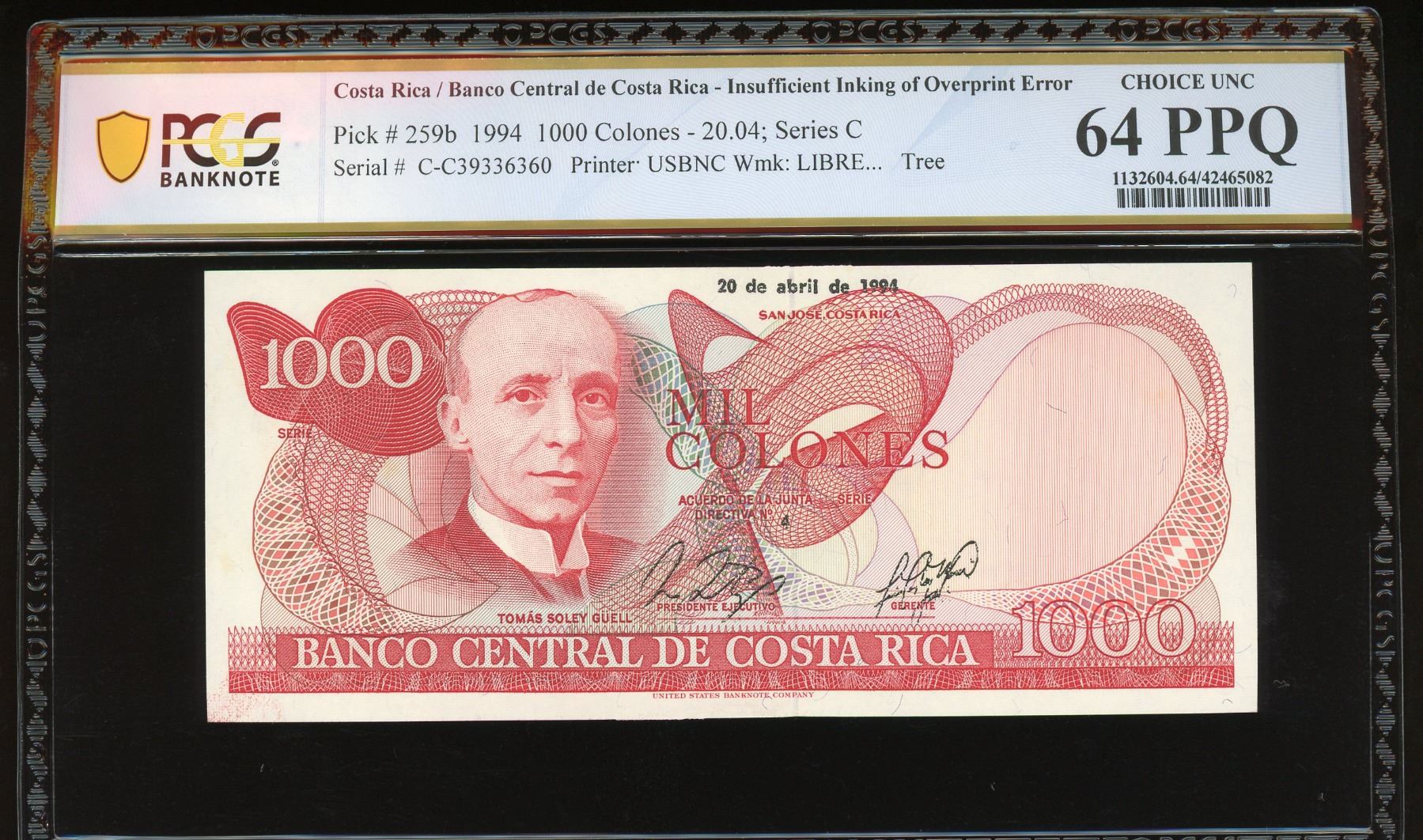 San Jose, Costa Rica, Banco Central, 1000 colones, 20-4-1994, insufficient inking of overprint error, PCGS Choice UNC 64 PPQ. SCWPM-259b. Both the series and serial number are not visible on this error note, though the bold embossing for the serial numbers makes them almost legible upon inspection. Choice original paper quality and strong ink colors (where printed). Pedigreed to the Tamarindo Collection of Costa Rican Error Paper Money. Please use this link to verify the certification number