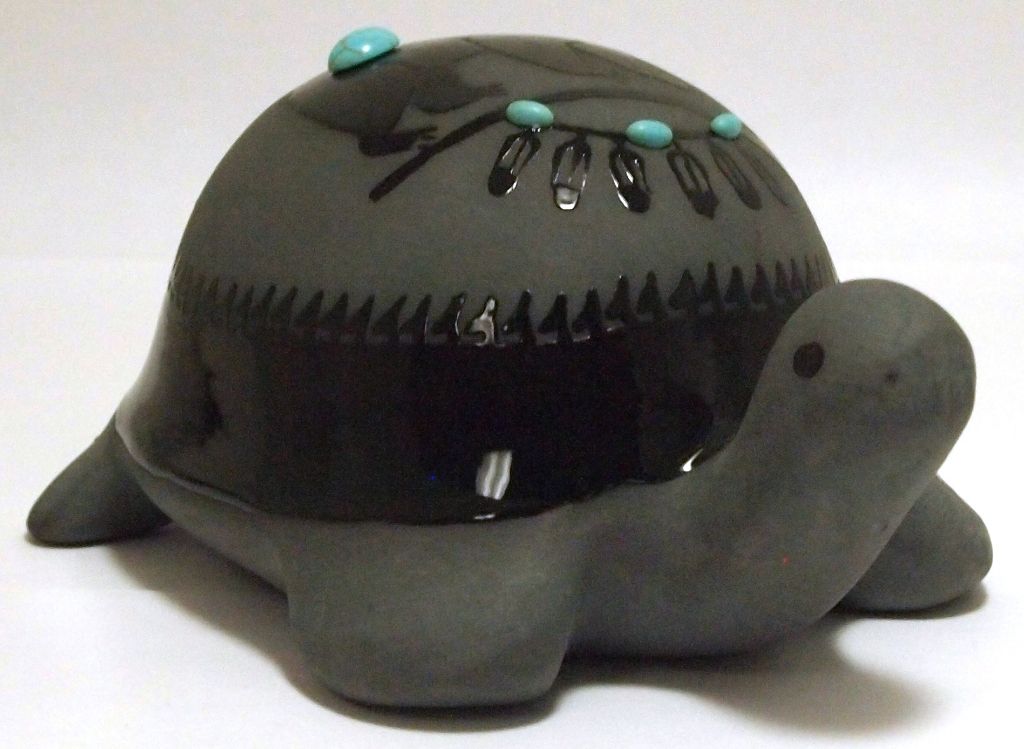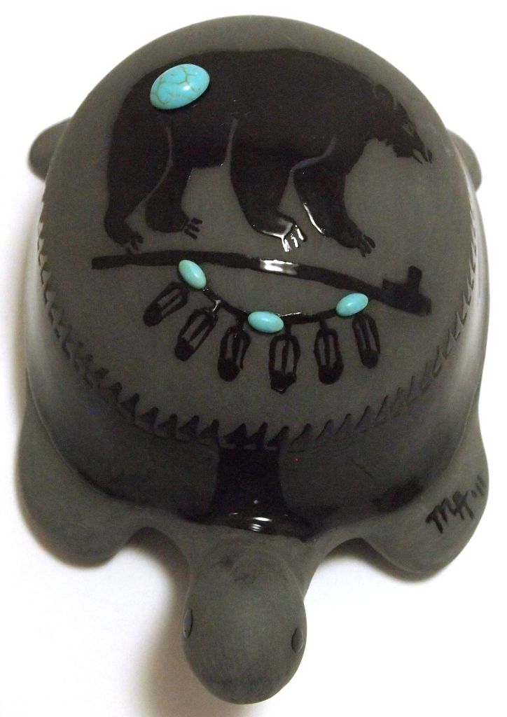 San Juan Pueblo Black Pottery Turtle with Bear & Turquoise on Top - Marie Adelcia