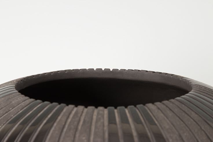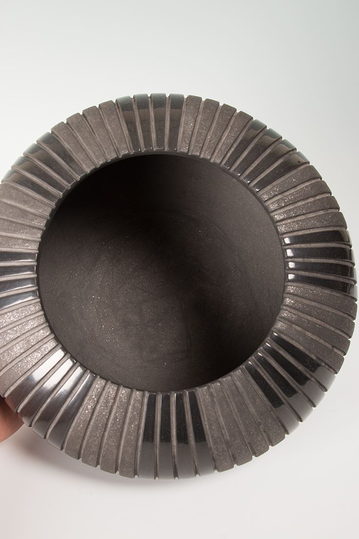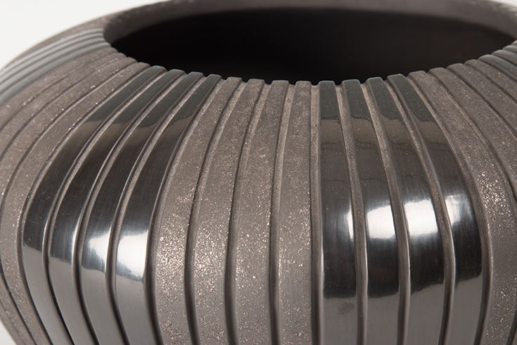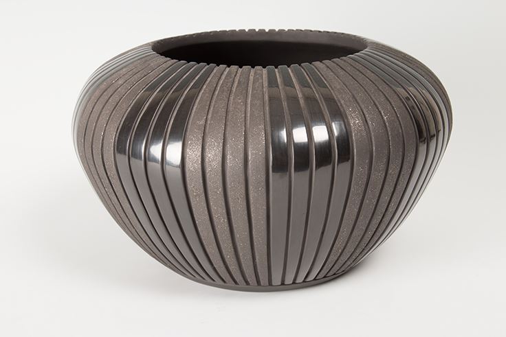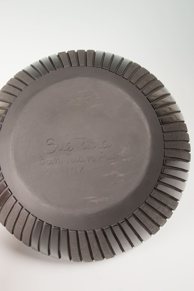 San Juan Pueblo Melon Pot by Sue Tapia. 7" x 12". Blackware pot with both polished and matte finishes. Signed on bottom: Sue Tapia. San Juan Pue. NM.