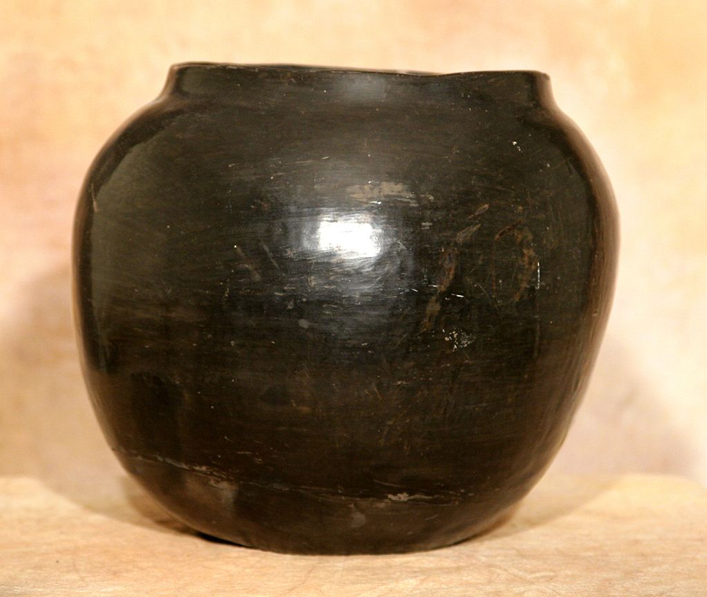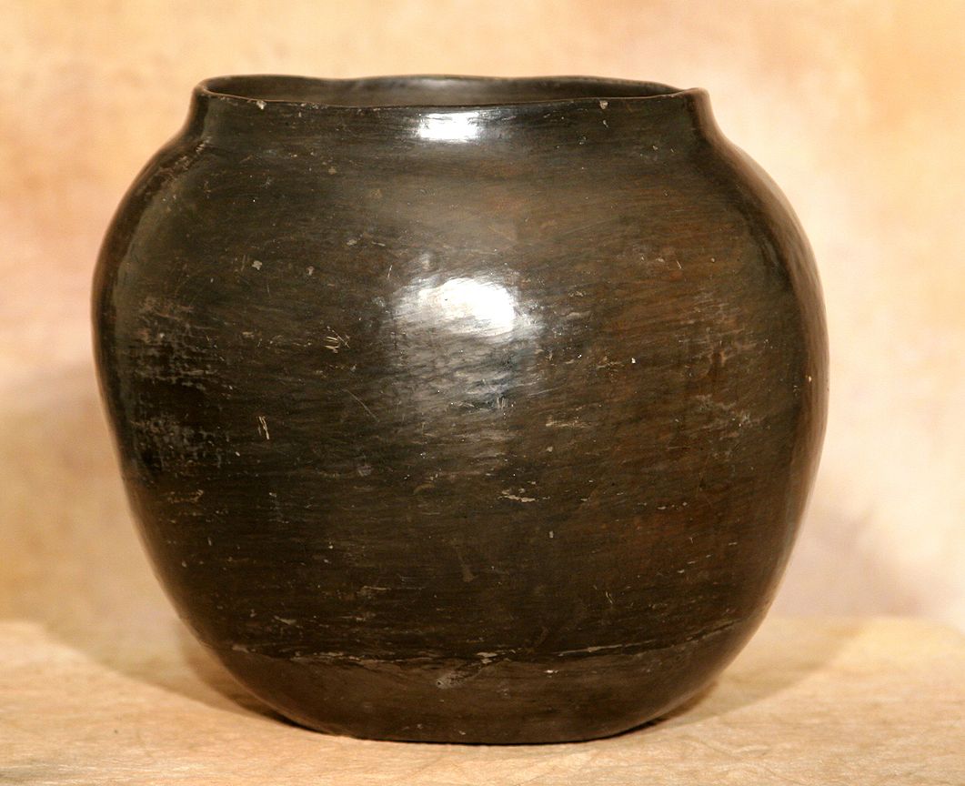 San Juan Storage Jar. 9 ½" tall x 10 ½" diameter. Inscribed on bottom: Candelena Collection. 19th century. (est. $900-1,200). CONDITION REPORTS: www.auctioninsantafe.com/docs/cr2012.pdf
