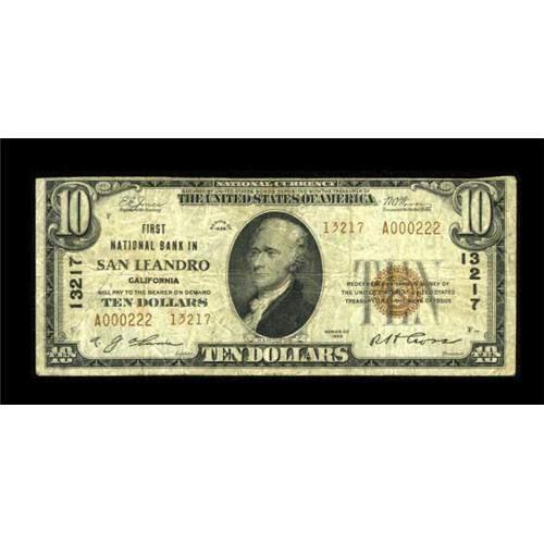 <B>San Leandro, CA</B></I> - $10 1929 Ty. 2 <B>The First NB</B></I> Ch. # 13217<BR> Only small size notes were issued by this Bay area bank. <B>Very Good-Fine</B></I>.<B></B></I><BR><I>From The Kansas City Collection.</B></I><BR><BR><b>Shipping:</b> Coins & Currency (<a target="_blank" href="http://www.heritageauctions.com/common/shipping.php">view shipping information</a>)