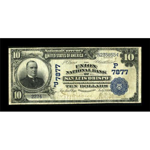 <B>San Luis Obispo, CA</B></I> - $10 1902 Date Back Fr. 617 <B>The Union NB</B></I> Ch. # (P)7877<BR> <BR>One of the more difficult locations in California from which to obtain even one note, as this city had only two banks, one of which is represented only by a single Brown Back, with this the other. This institution issued only Third Charter notes until it closed in 1922, with a current census population of just eight pieces. As one might imagine, offerings of any kind from here have been few and far between, with none at all since we sold the Horwedel collection example, in just slightly lower grade than this piece, for $3220 in 2004. Pen signed <B>Fine+++.</B></I><BR><I>From The Kansas City Collection.</B></I><BR><BR><b>Shipping:</b> Coins & Currency (<a target="_blank" href="http://www.heritageauctions.com/common/shipping.php">view shipping information</a>)