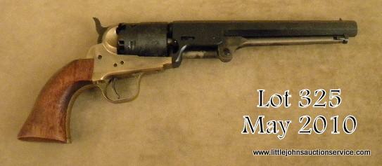 San Marco Arms reproduction of a Colt Model 1851 Navy percussion revolver, .36 cal., 7-1/2” barrel, blue, case hardened finish with brass frame and straps, wood grips, #95543. This Italian-made copy is in overall excellent condition showing littlhandling or use, crisp action, fine bore, fine grips; with original cardboard box numbered to this gun. Est.: $200-$400.