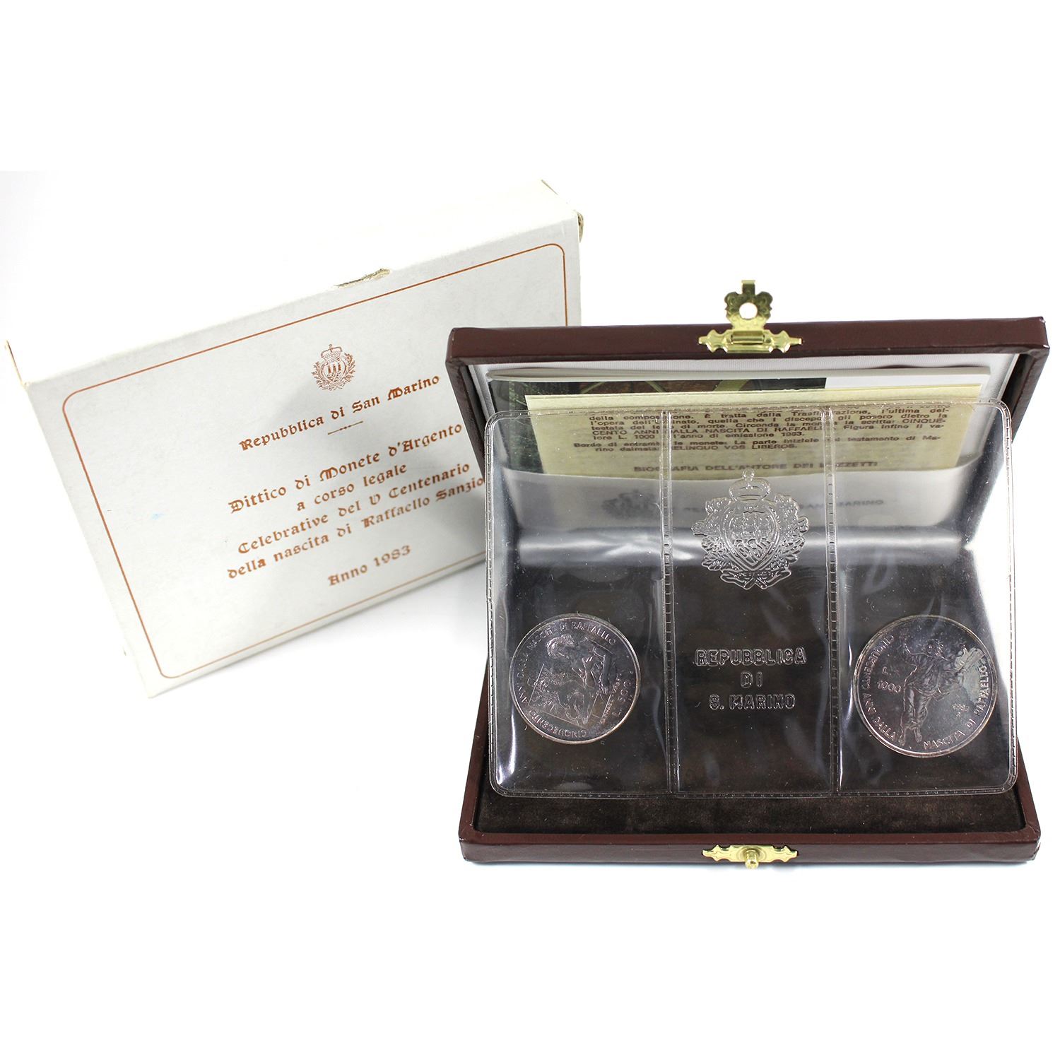 San Marino 1983 2-piece 500th Anniversary Raffaello Sanzio .835 Silver Coin Set. Includes: 500 Lire, & 1000 Lire. Attractive hues of amber and violet. Plastic seal cracked; fingerprints on 1000 Lire coin
