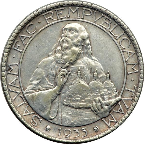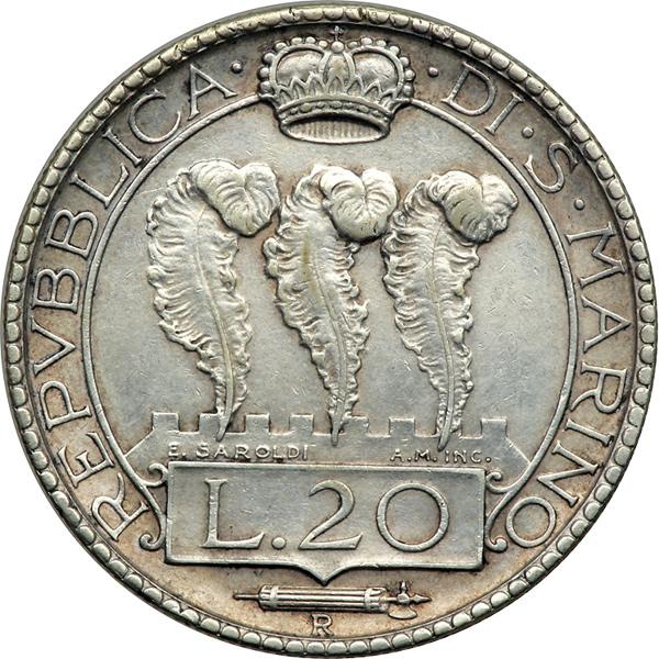 San Marino. 20 Lire, 1933-R. Dav-303; KM-11. Saint holding castles. Very Fine.