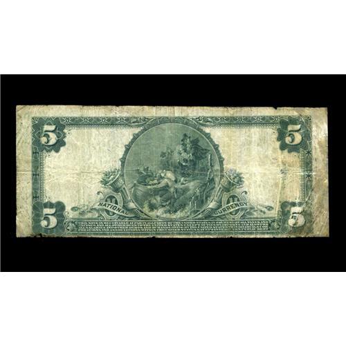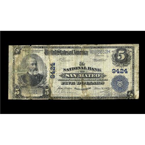 <B>San Mateo, CA</B></I> - $5 1902 Plain Back Fr. 600 <B>The NB of San Mateo</B></I> Ch. # 9424<BR>From a popularly collected suburban area just South of San Francisco, this bank has just nine large pieces listed in the census. This example is a well circulated <B>Very Good</B></I> that may have been carried as a wallet keepsake.