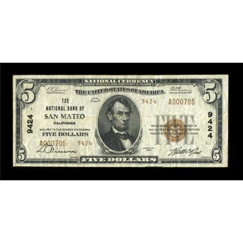 <B>San Mateo, CA</B></I> - $5 1929 Ty. 2 <B>The NB of San Mateo</B></I> Ch. # 9424<BR> A pleasing <B>Very Fine </B></I>with ideally original paper that is bright and still partially embossed.<B></B></I><BR><I>From The Kansas City Collection.</B></I><BR><BR><b>Shipping:</b> Coins & Currency (<a target="_blank" href="http://www.heritageauctions.com/common/shipping.php">view shipping information</a>)