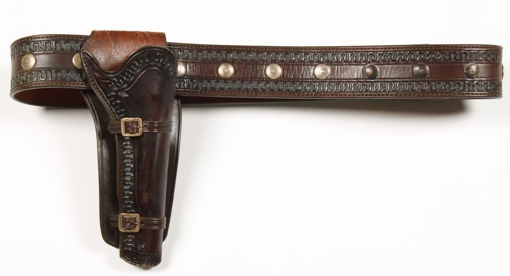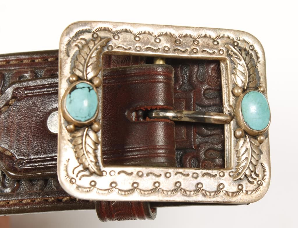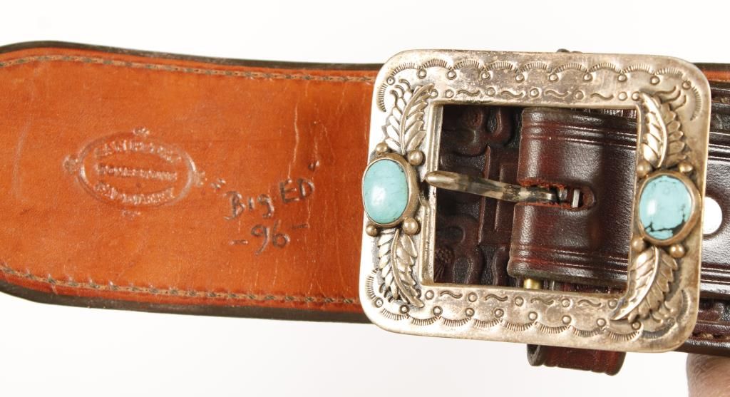 Brown leather with tooled design. Stamped "Big Ed 96". With (2) turquoise like stones on buckle. Approx 54" long. In good condition.
