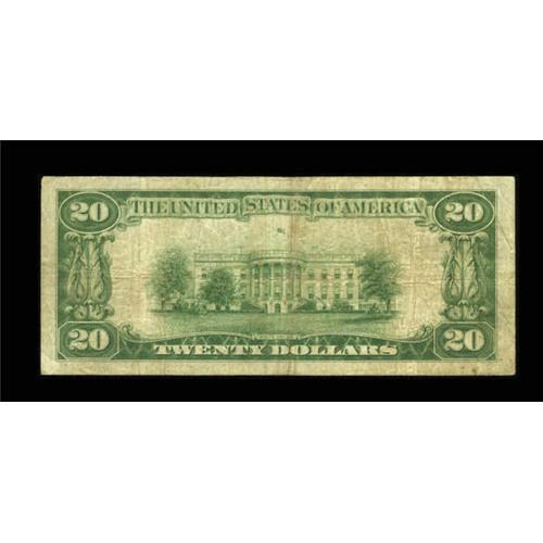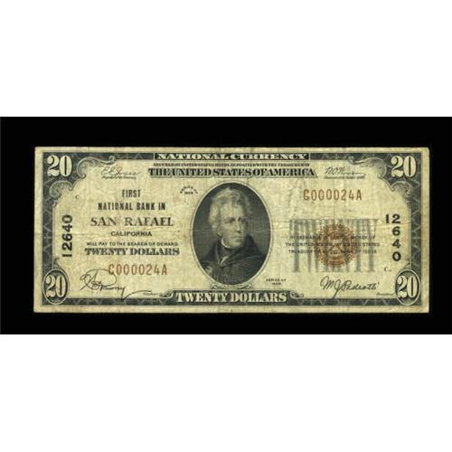<B>San Rafael, CA</B></I> - $20 1929 Ty. 1 <B>First NB</B></I> Ch. # 12640<BR> Despite receiving its charter in 1925, this Marin County bank elected to issue Series 1929 examples only. While not excessively rare, with eleven examples known, notes from this location are inordinately popular, with collector demand driving prices up to levels which seem inexplicable to collectors from other states. The Horwedel collection note, for example, graded Very Fine and sold for $4140. Expect this evenly circulated <B>Very Good-Fine</B></I> piece to bring a slightly lower but still substantial figure. <BR><I>From The Kansas City Collection.</B></I><BR><BR><b>Shipping:</b> Coins & Currency (<a target="_blank" href="http://www.heritageauctions.com/common/shipping.php">view shipping information</a>)