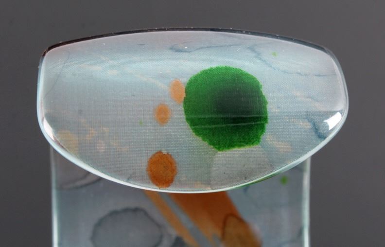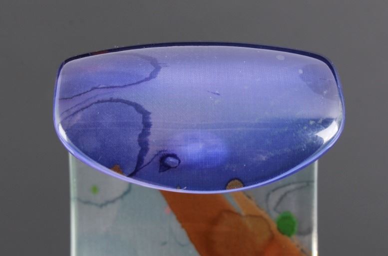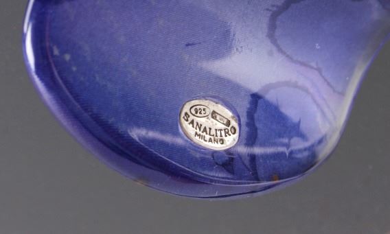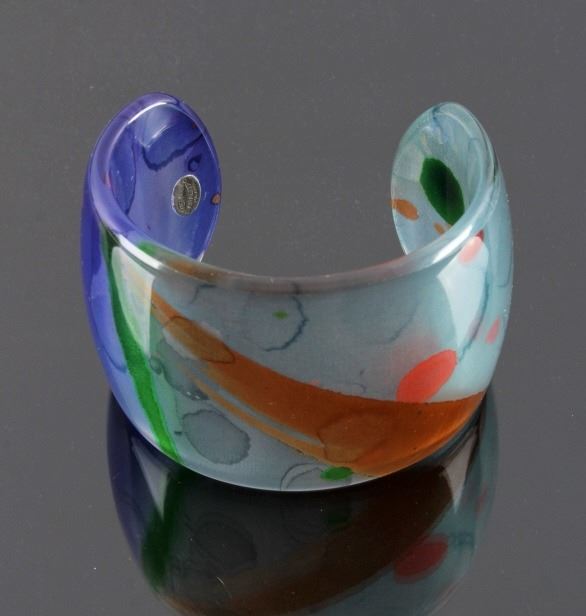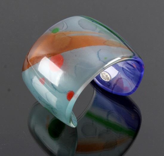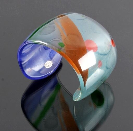 This is a Sanalitro signed Italian designer silk bracelet. The bracelet has a dyed silk center with an acrylic covering. The sterling silver hallmark on the inside is marked "925 Sanalitro Milano". The bracelet is in good condition. It measures 2" x 2.5" and is 2" wide.